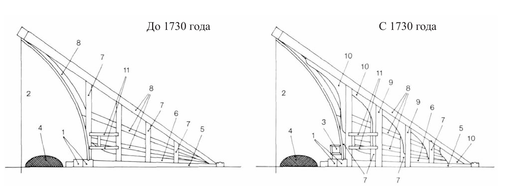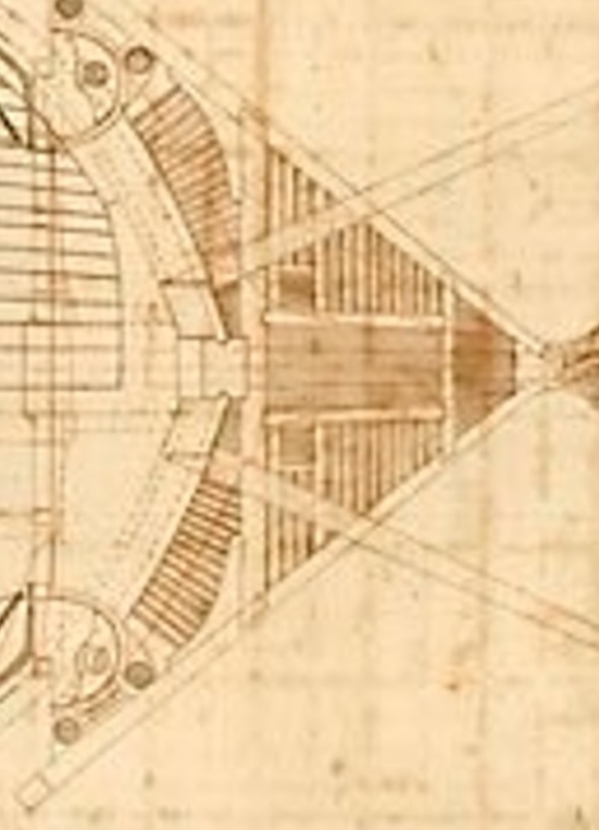 Иногда можно что-то найти из книг по теории кораблестроения, правда, редко. Из архивных, вот чертёж гальюна за авторством Авраама Рииса. Отлично видно, что малые регели имеют поперечные, а не косые срезы в предполагаемом месте стыка с рукой сапортуса или с корпусом - то есть, никаких "плавных заострений". Всё по науке, всё - с учётом крайне капризного строительного материала.
