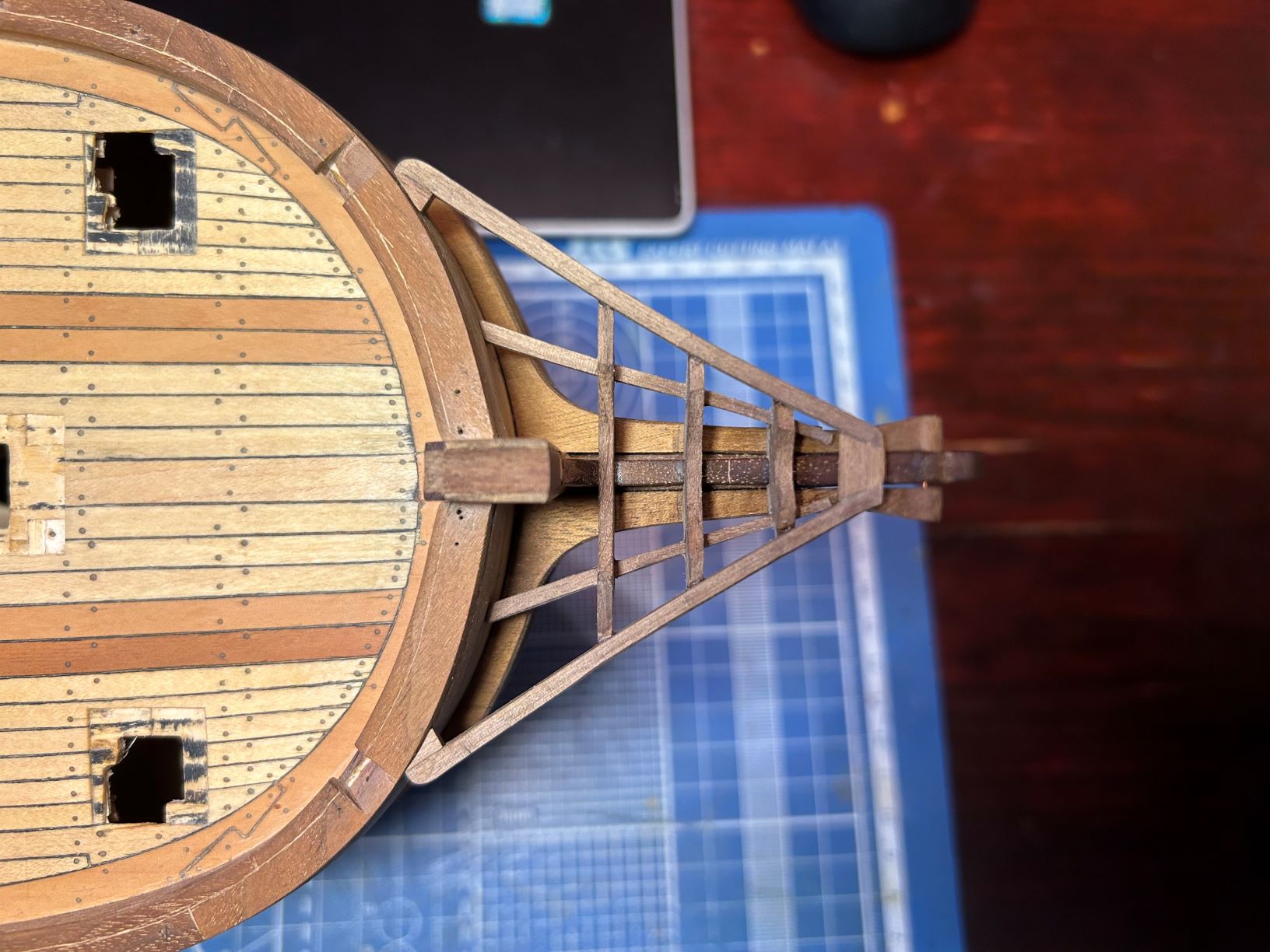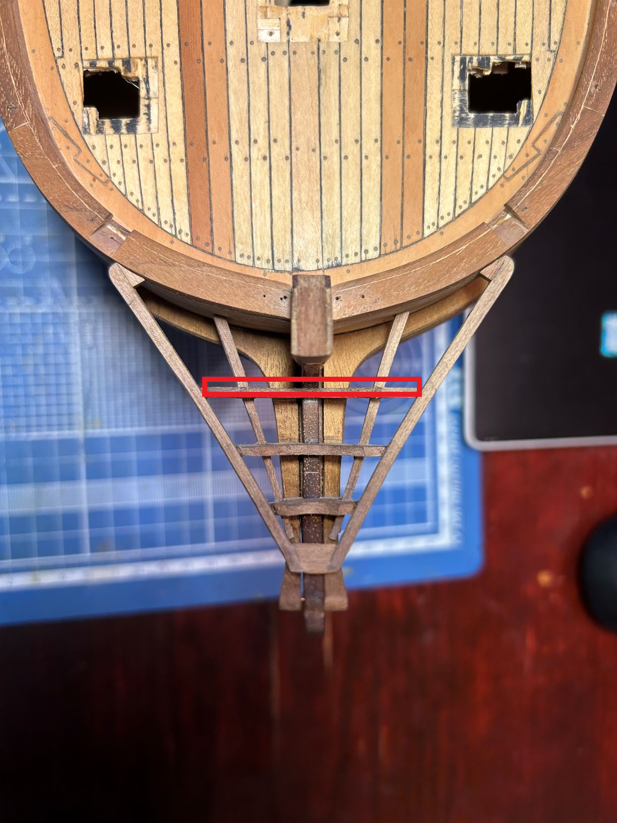 1. Опираясь на Анчерла сделал гет-бимс, кросс-пис и карлингсы, которые формируют проём в палубе гальюна. В этот проём проходит ватервулинг бушприта. Есть некоторое сомнение в части его (проёма) ширины. Анчерл показывает ширину проёма чуть меньше ширины штевня, но на большинстве музейных моделей он значительно шире. Как быть? Если следовать чертежам Анчерла не будет ли потом проблема в проведении ватерулинга? Игорь, по твоему опыту что скажешь? Может переделать пока не поздно? Понятно, что ватервулинг сжимается поперечными шлагами (фото гальюн 6), но всё равно меня мучают сомнения. На всякий случай уточню: диаметр бушприта на модели будет составлять 8мм, ширина проёма в палубе гальюна - 6мм.