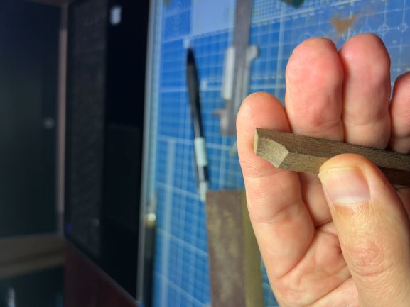 1. Берём рейку (в моём случае орех размером 9х9мм и начинаем придавать одной из грани соответствующую форму. Делаем этот шаг на цельной рейки для удобства (держать рукой проще).