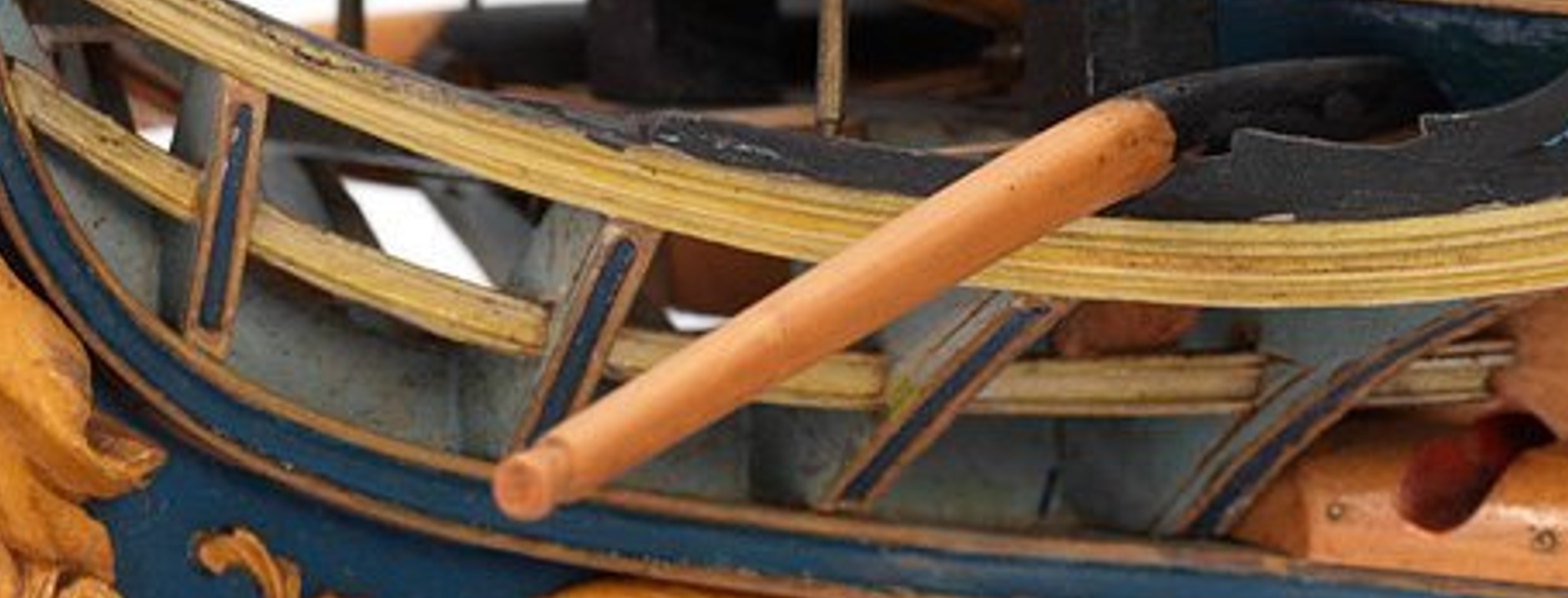 Бывает, деревянная деталь очень тонкая, длинная, и не имеет достаточных точек фиксации. Такие детали, если под покраску, лучше не делать из дерева, а использовать металл. Тонкое незакреплённое дерево (выстрел, лисель-спирт, брам-стеньга и тп) очень сильно подвержено влиянию окружающей среды. Влажность, температура в квартире, действие такелажа - и вот дерево "повело". Кроме того, деревянные детали, даже находящиеся не под нагрузкой и/или не длинные, но маленькие, могут быть сделаны из рыхлого дерева, а то и из пересушенного. Такие мало что не держат нагрузки, они буквально рассыпаются. Так же из малых деталей очень быстро испаряется тот самый лигнин, и изначально не рыхлое и не пересушенное дерево таковым становится через пару-тройку лет и разрушается. Или же нет у нас ни качественной берёзы, ни груши, а вот орех (из набора, так вечно рыхлый и/или пересушенный), да ёлка, или там липа...