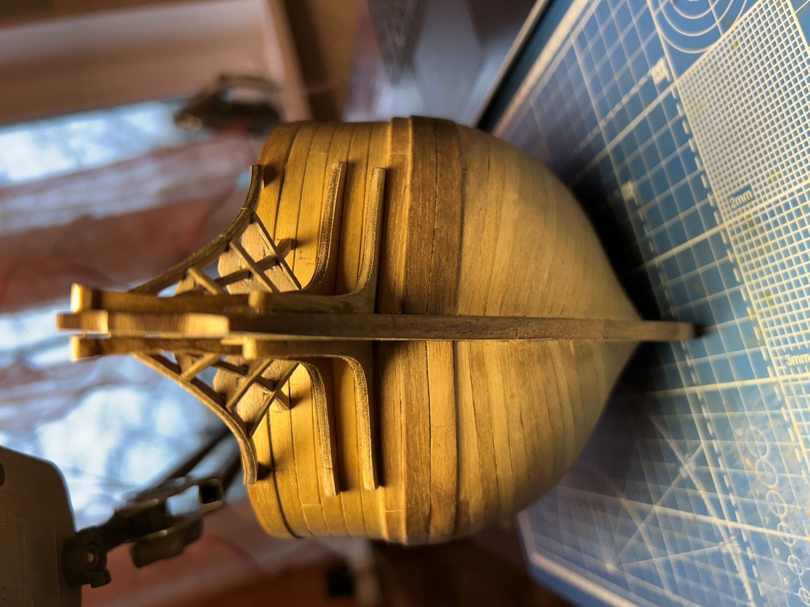 3. Подогнал регели к шпангоутам. Вот это, наверное, самый кропотливый момент, который занял уйму времени. Верхние регели со стороны корпуса крепил на штифты (насухую разумеентся), со стороны княвдигеда после подгонки на капельку циана для временной фиксации. Только после этого занимался нижними регелями.