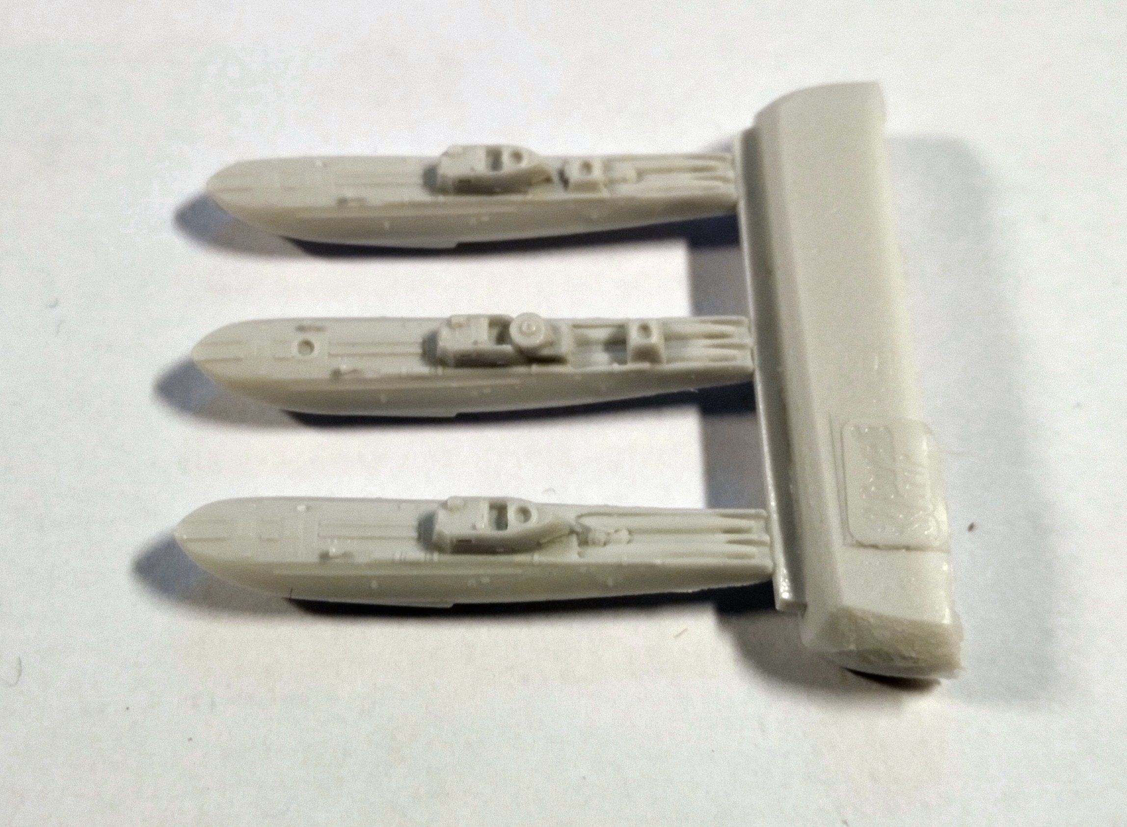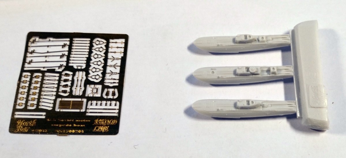 Во время предновогодней уборки нашел в своих запасах такой вот набор от НордСтар Моделс. Набор из трех смоляных корпусов и маленькой платы травления позволяет собрать 3 катера, один из средних серий с одним ДШК на надстройке, один поздний с ДШК на надстройке и еще одним на корме, и один в "ракетном" варианте с РС-82 на надстрйке, ДШК на корме, и ДА в носу.