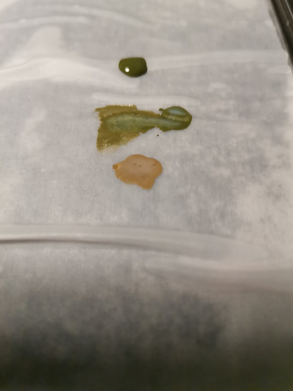 @Махмуд написал:Вот такое у меня после 10-15 минут держания палитры в закрытом состоянии в прохладном месте. Вот эти белёсые потёки - это от избытка воды, все уже с таким сталкивались. Калька - обычная художественная, плотностью в районе 100г/м2. Обратите внимание, что дальняя зеленая капля попала на воздушную подушку, потому воды в неё попало мало, и она не побелела и не высохла.