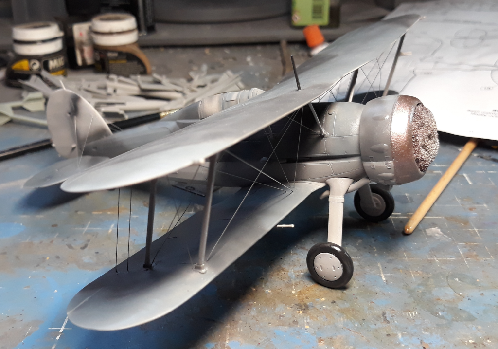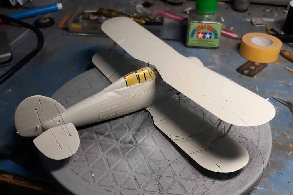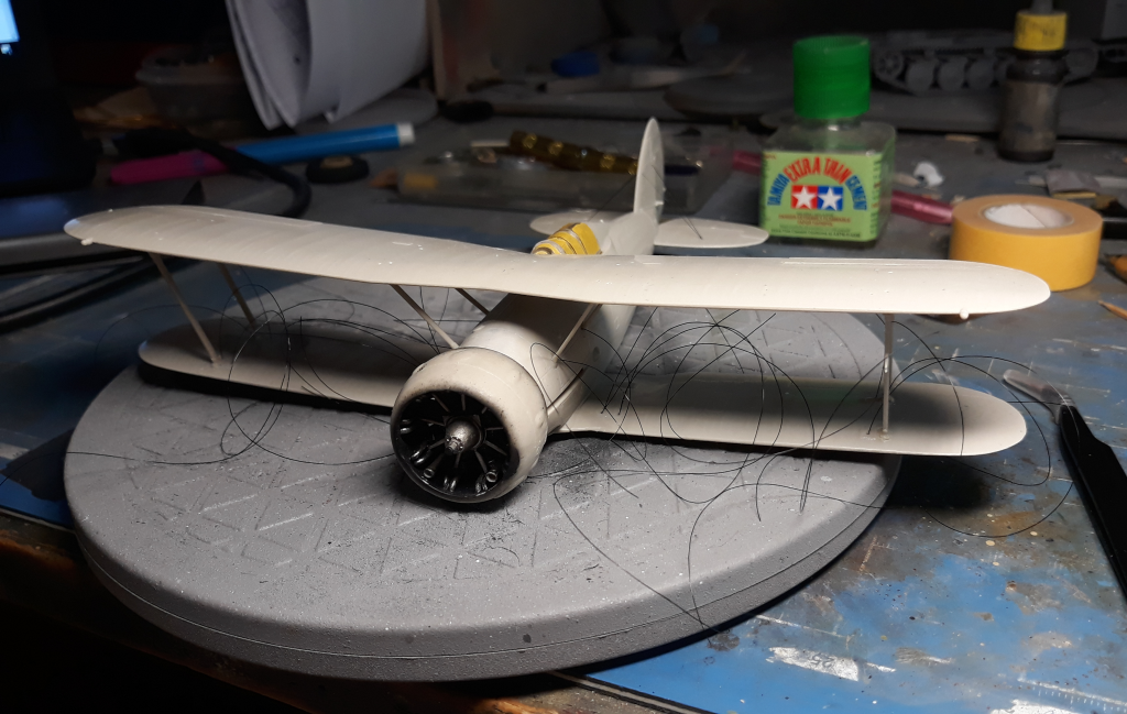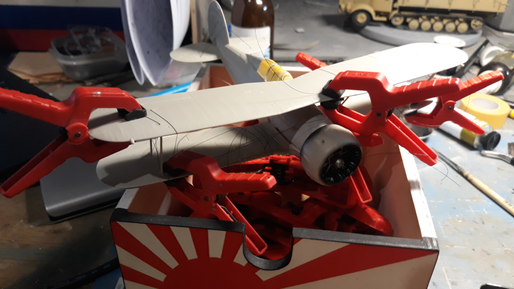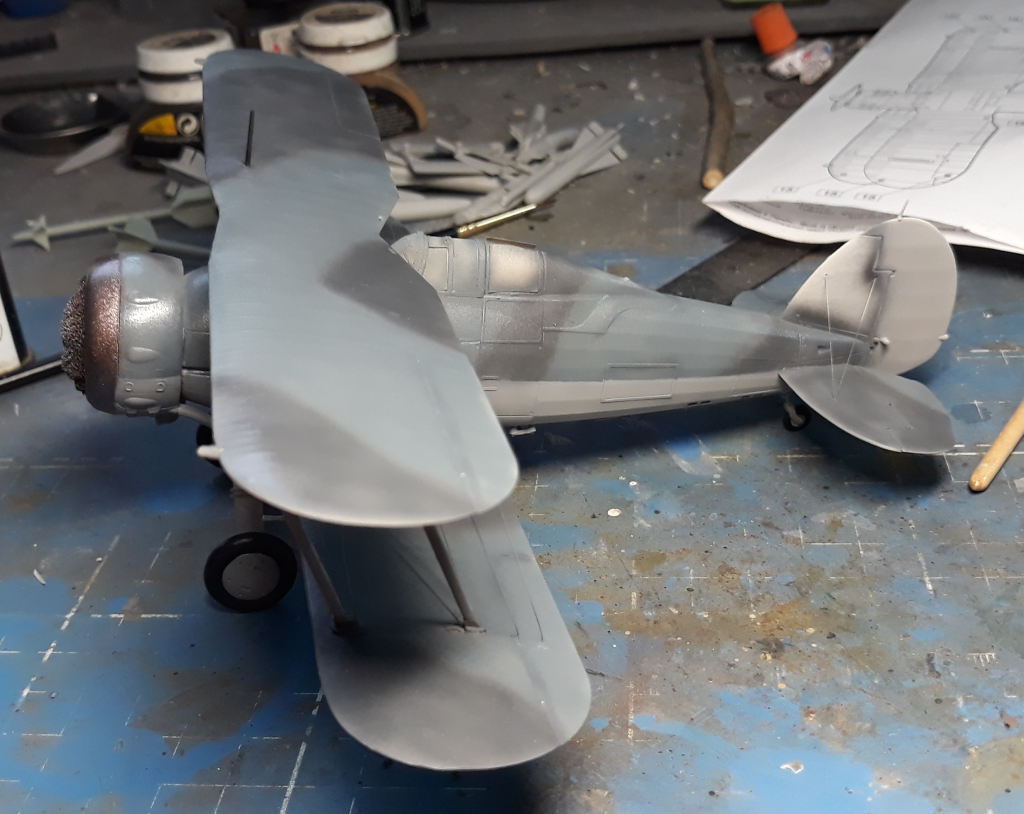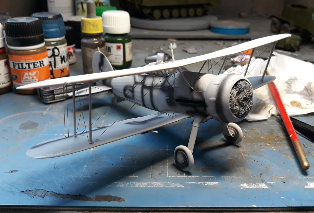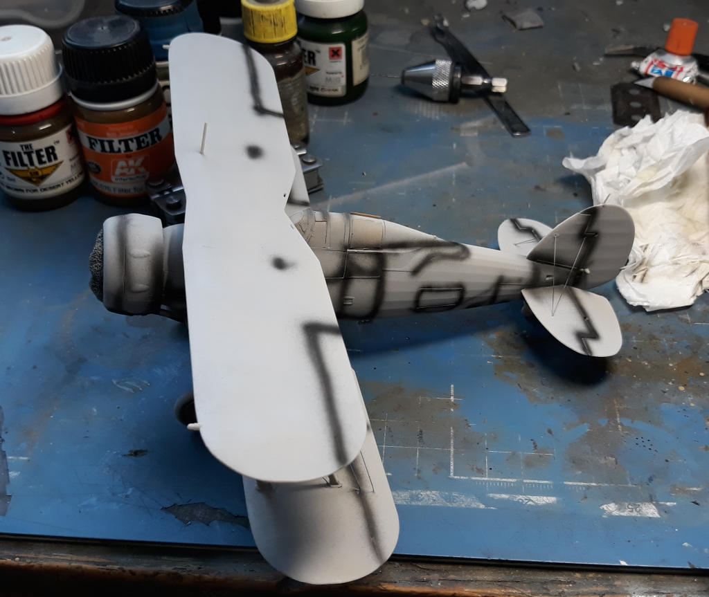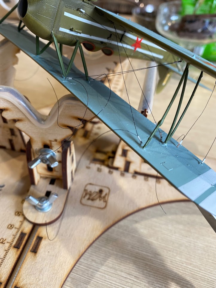 И вот только сейчас понял что надо было предварительно загрунтовать самолет и покрасить хотябы низ верхнего крыла