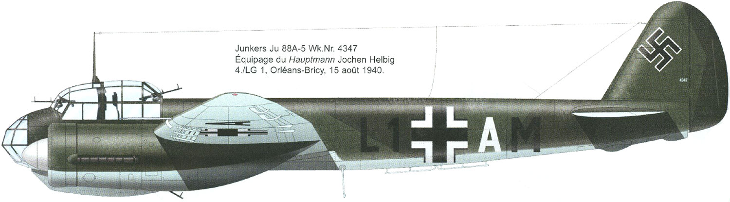 " Став командиром эскадрильи 4/LG-1 в мае 1940 г, Хелбиг сражался на новом Ju-88 в Бельгии, Голландии и Франции. 2.06.40 г над Дюнкерком ему пришлось в течение 20 минут отбиваться от четырех «Спитфайров»; на совершенно изрешеченной машине, с израненным экипажем, Хелбиг сумел оторваться от противника и вернулся на базу. В разгар битвы за Англию 15.08.40 г эскадрилья Хелбига, шедшая на Саутгемптон без истребительного прикрытия, попала под удар 80 «Харрикейнов» и «Спитфайров». 8 Юнкерсов были сбиты, лишь «L1+AM» самого Хелбига сумел вырваться"
