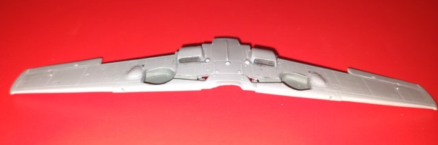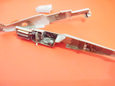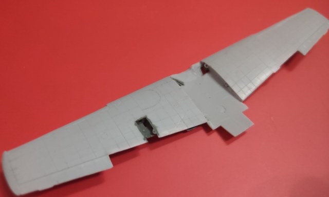 2. Плоскости проклепаны, срезаны предкрылки и закрылки. Закрылки нарощены. Обтекатели радиаторов изнутри расточены, Установлены решетки радиаторов и внутренние перегородки. На одном крыле открыт отсек, к которые на Е-1 ставился пулемет (на Е-4 он будет пустой, но крышки сохранились).