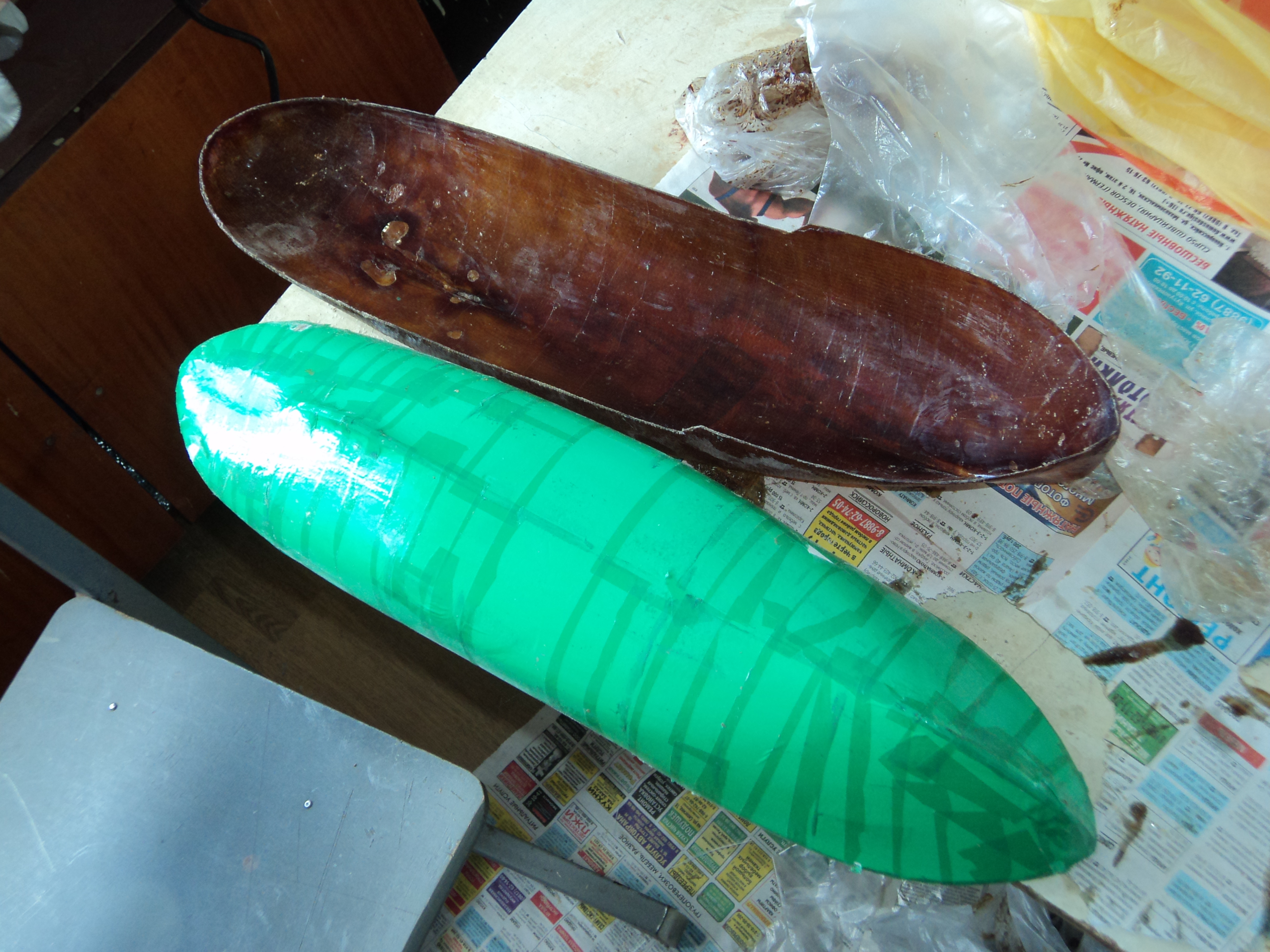 После окончательной обработки,для удобства,болван закрывался скотчем,на который наносились (через разделитель - жидкий силикон) 3 слоя стеклоткани на эпоксидке.На фото - снятая с болвана "корка" корпуса