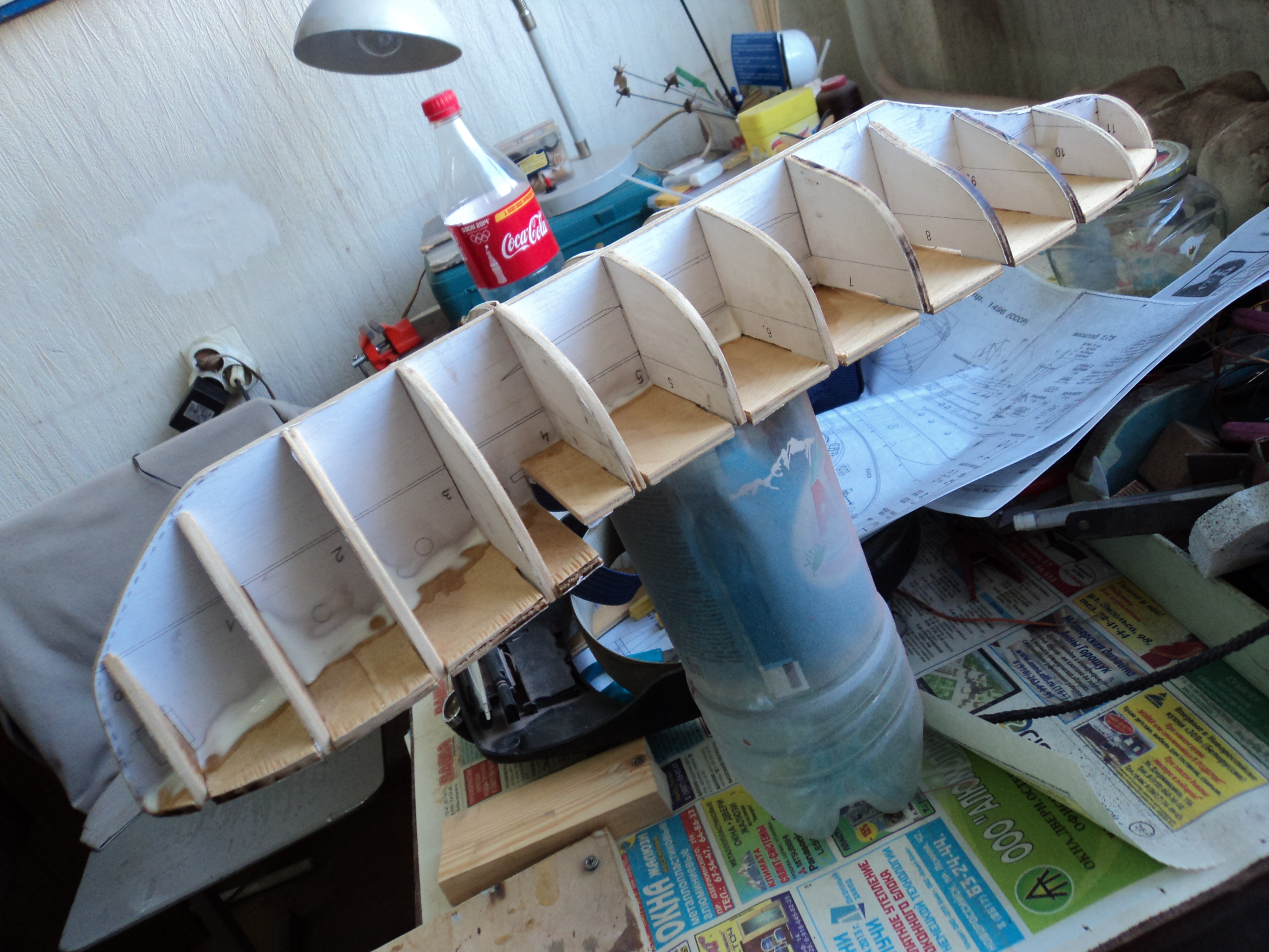 на фанерную фальш-палубу,которой раскреплялся корпус;фальшборт изготовил из пластика (1мм),планширь - пластик 0,5 мм.На фото на палубе стоит первоначальная стадия изготовления надстройки,т.е. по развертке вырезана из латуни и частично спаяна.Для придания формы надстройке,исползовал деревянный кондуктор...