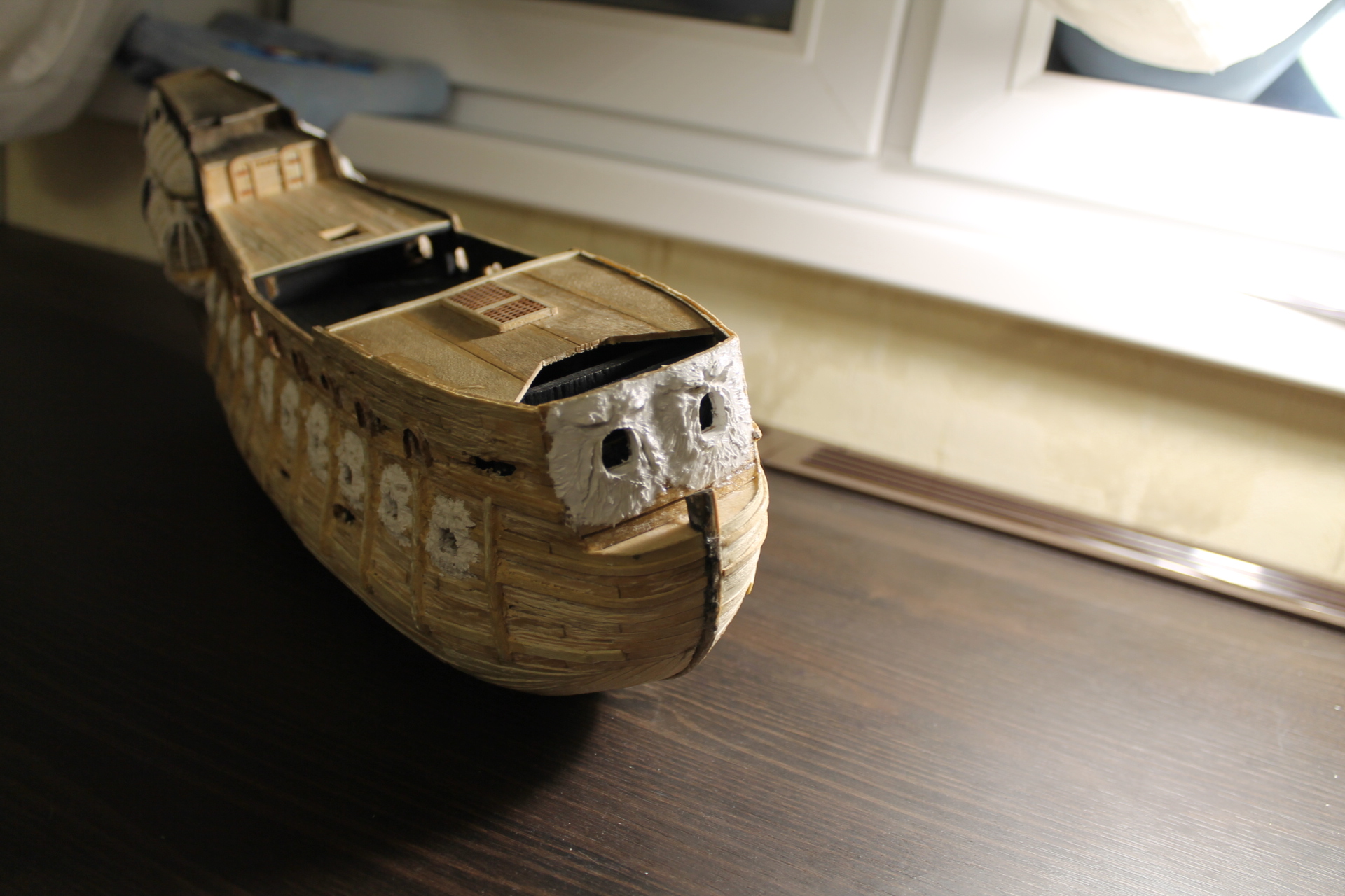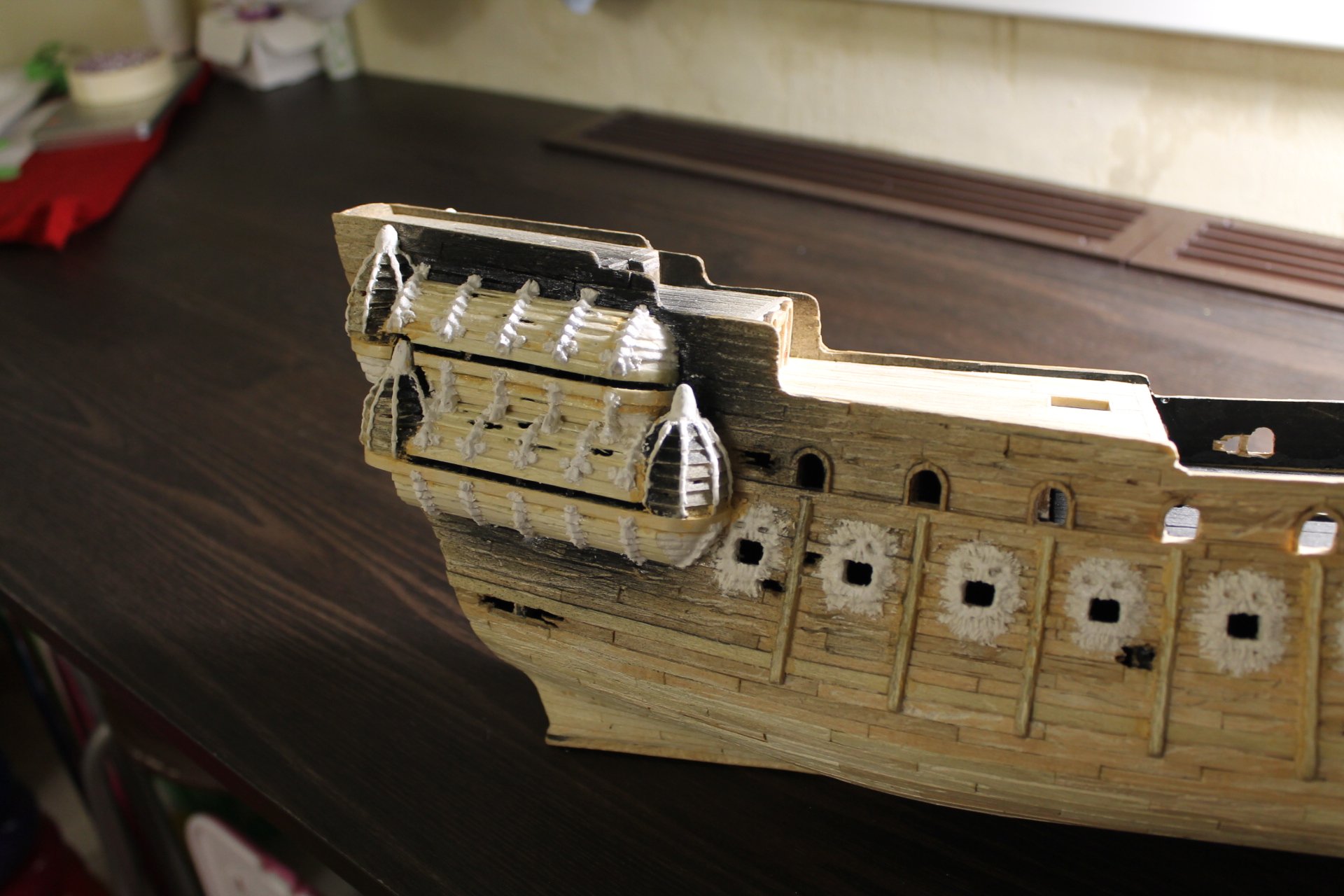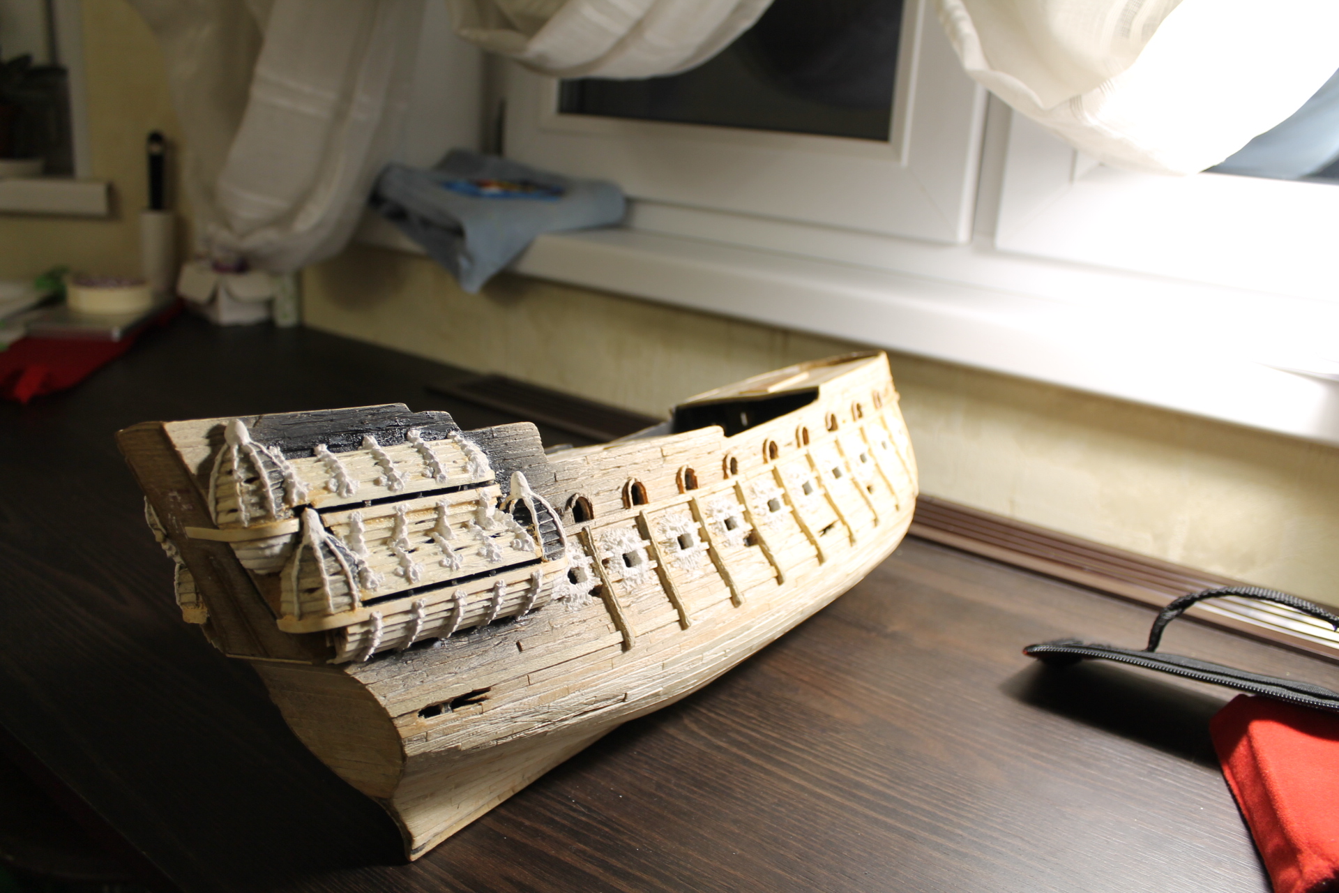 Пока что все идет по плану и очень даже хорошо. Делай фотки 1600*1200, а то смотреть крайне трудно. Предупреждаю, что среднюю орудийную палубу во всей красе надо сделать и покрасить уже сейчас, иначе потом в нее не подлезть