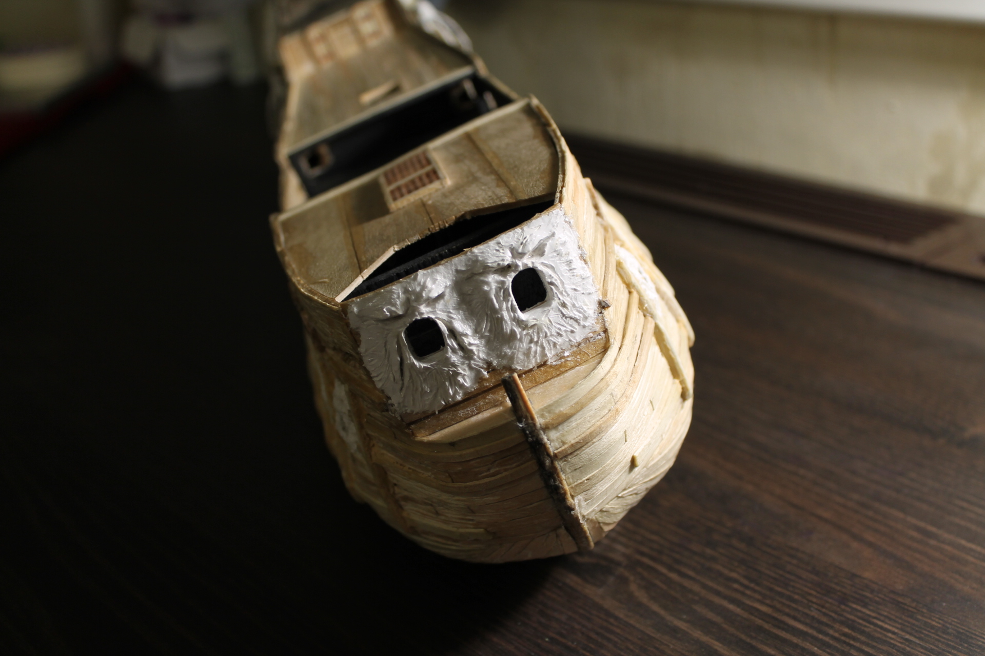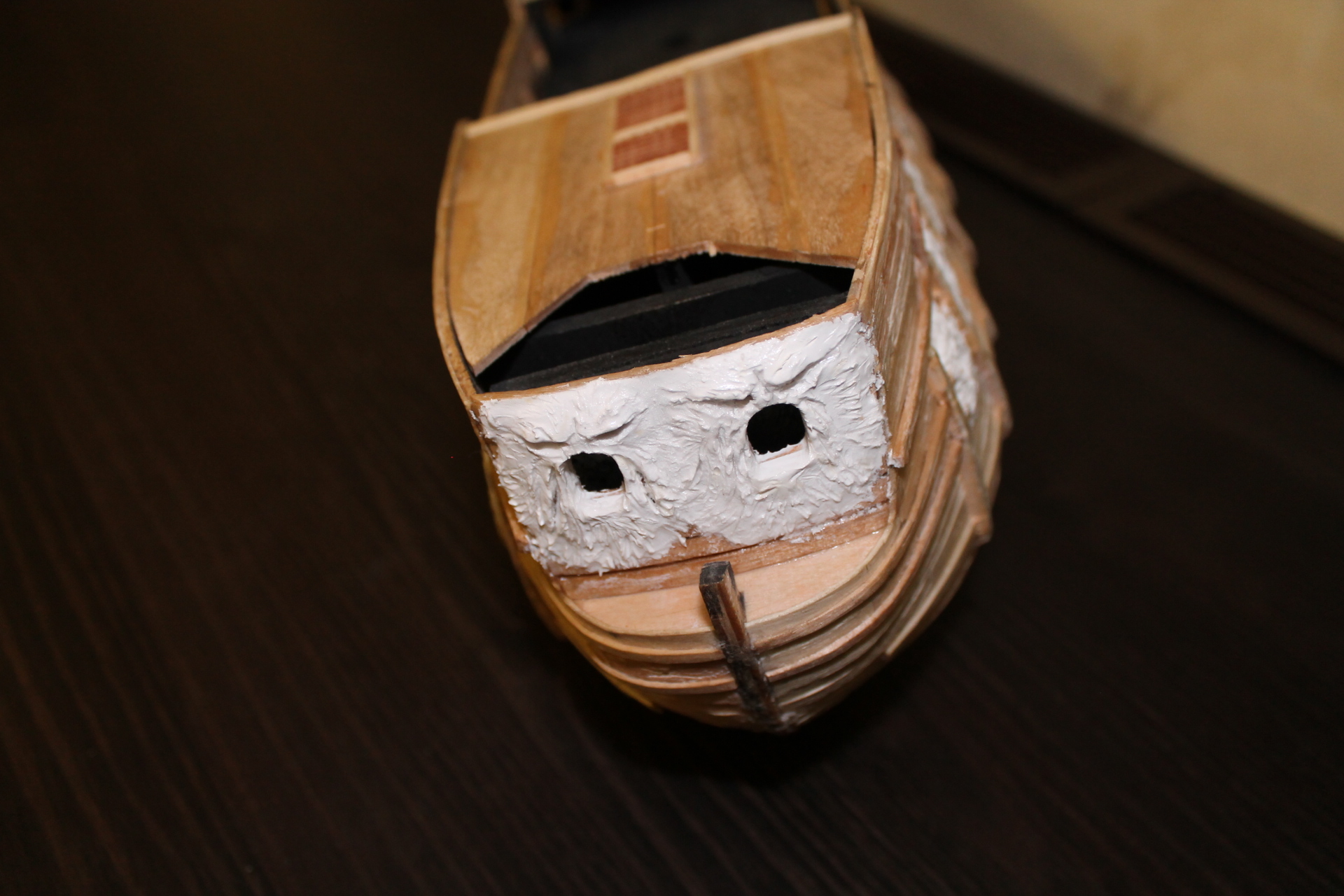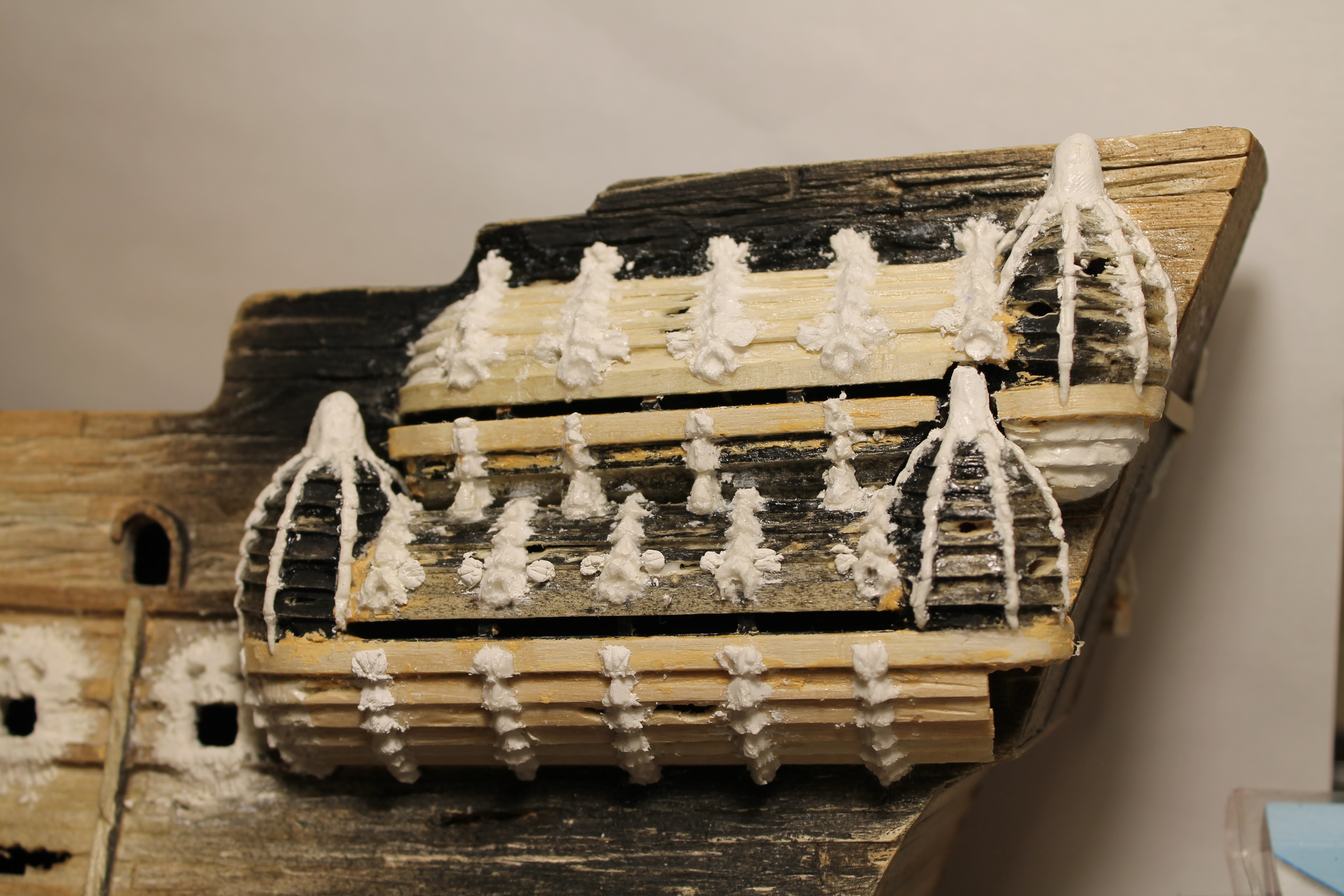 Здравствуйте! После длительного отпуска, вернулся к кораблику. Доделал рыб на галереях правого борта, потом вылепил морды лица которые спереди. Морды делал из толстого слоя массы для лепки и скорее всего, она бы растрескалась, но 2 щедрых слоя "космофена" сверху, превратили массу в подобие пластика.