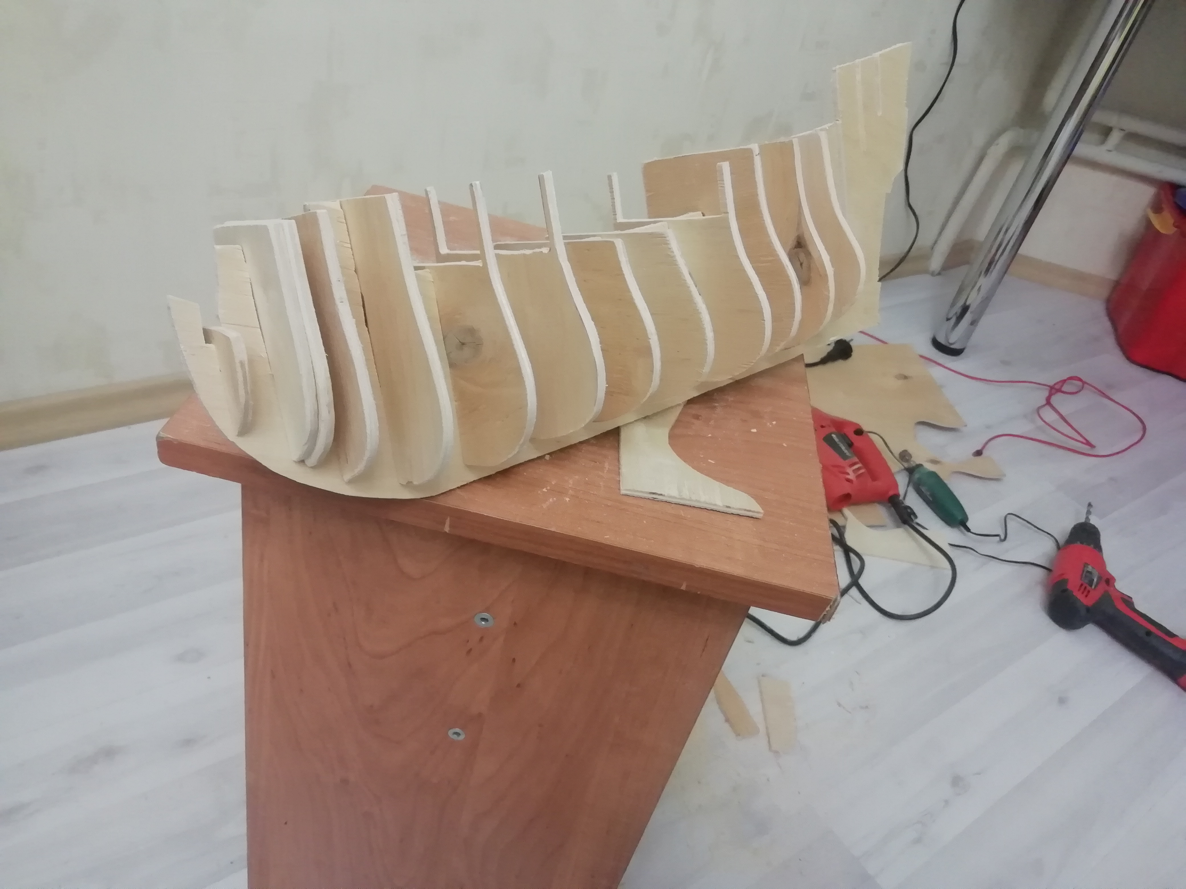Здравствуйте коллеги! Сразу хочу извиниться за орфографические ошибки, об этой проблеме знаю и борюсь с этим.)) Наткнулся в просторах интернета на необыкновенную модель Летучего Голландца. Заболел жутко и решил попробовать свои силы в моделировании. Автор любезно поделился чертежами, чем я безумно благодарен. Проштудировав интернет в поиске других образцов данной модели, понял что исходный обладатель и если позволите - разработчик чертежей никто иной как Анатолий Печников. Анатолий, привет с просторов интернета.)) Итак решено было собрать каркас из фанеры 4,5 мм. Чертежи распечатал в масштабе 75%, таким способом корабль получился в масштабе 1:73 (нехитрым способом высчитал исходя из того что у Анатолия они 1:55). Сделал я это для того чтобы корабль занимал меньше места и как оказалось потом для геморроя с мелким декором. Черновую обшивку сделал из линеек. Чистовую обшивку из шпона от фанеры для фруктовых ящиков 1мм, предварительно замочив и расслоив ее. Клеил все космофеном. Интересно было бы выслушать критику, только тапками не кидайтесь, я новичок.)