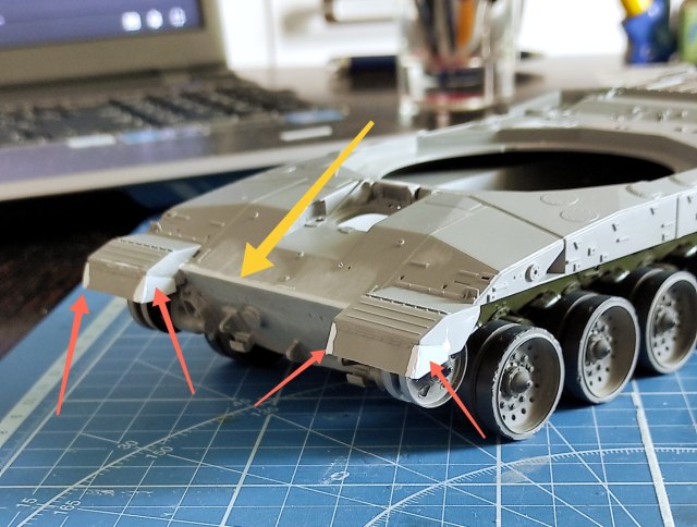- на некоторых поверхностях заметно покрытие, напоминающее антислип, и ладно бы только на горизонтальных и наклонных, но ведь и на вертикальных тоже; этот самый антислип не столь крупнозернистый, как на Меркавах, но всё равно отчетливо заметен; на модели от RFM эта фактура полностью отсутствует, равно как и у Тамии;