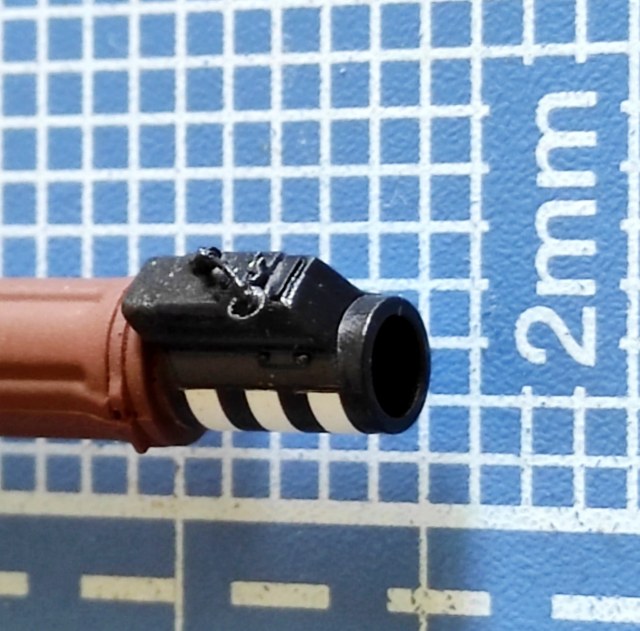 - MRS (muzzle reference sensor) над дульным срезом: защитные кожухи на обеих моделях как бы и не кожухи, ибо должны быть пустотелыми, потому что внутри там установлено зеркало; придется выбирать полость ножиком и борами, ибо это упрощение весьма заметно; и точно так же отсутствуют нарисованные на обоих боксартах пружинный шплинт и тросик на верхней крышке - см. мой Ч2;