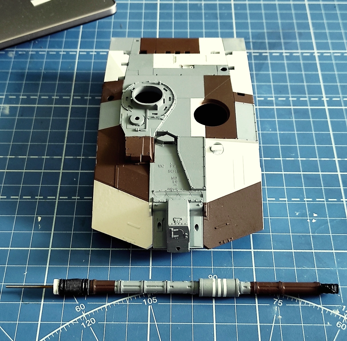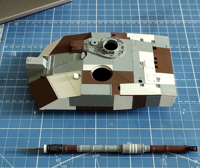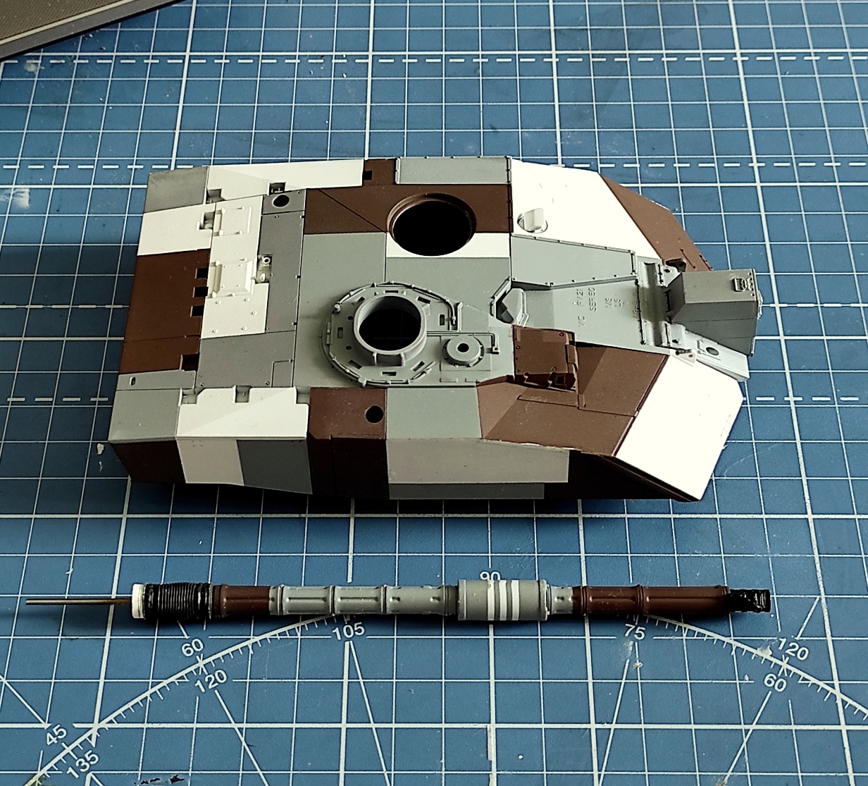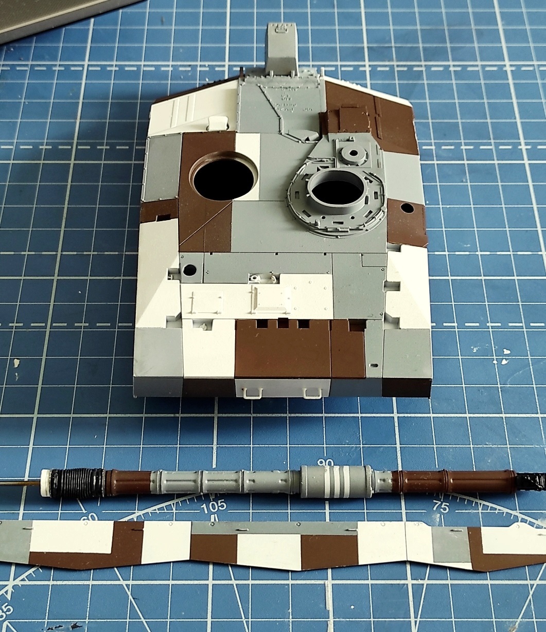 Поскольку открасить собранную модель в берлинский "ломающий" камуфляж с его абсолютно чёткими границами цветов, не переломав мелочевку, было бы весьма проблематично, я решил попробовать покрасить башню и корпус до установки многочисленных мелких деталей.