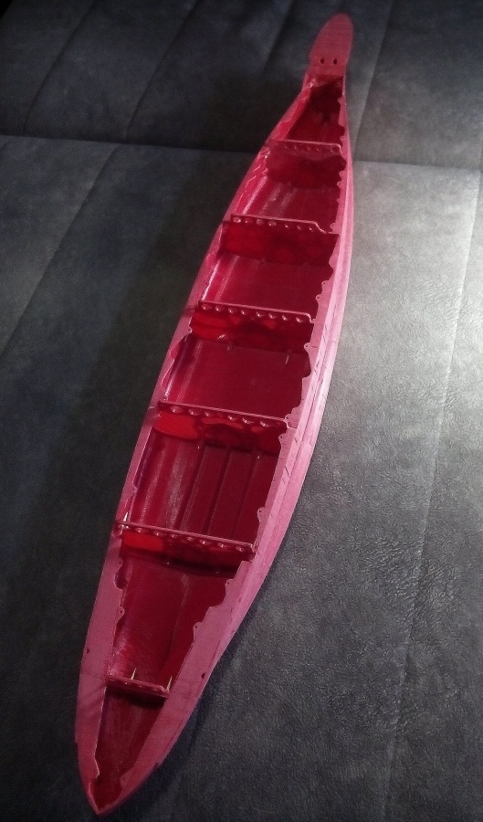 Вот прямо наверх секций, через который просвечивают отверстия и надо клеить шпоновую палубу.