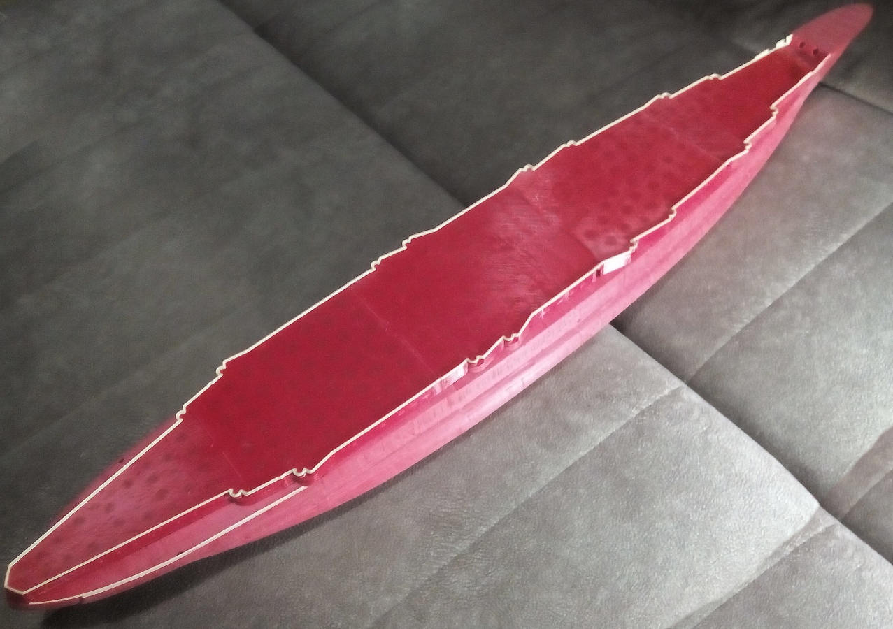 На линкоре плоская палуба, без погиби. Мы делали под готовую палубу из шпона лазерной резки. Но, конечно, можно сделать и пластиковую, 0.5 мм, нужно