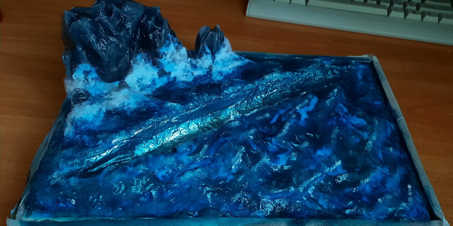 С помощью моделирующего геля и синтепона выполнил имитацию волн
