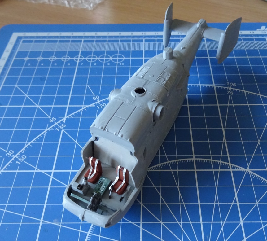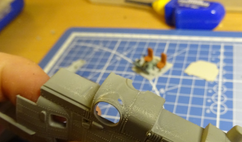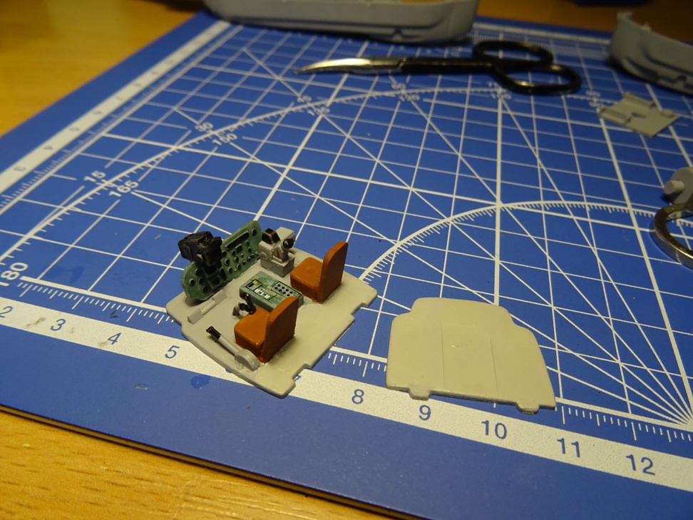 Сначала хотел заморочиться с интерьером кабины, т.к., то что дает "Звезда" это конечно жесть, причем не понятно что мешало сделать, хоть немного правдоподобно. Потом посмотрел, на довольно мутное остекление и подумал, что видно этого все равно толком не будет, поэтому даже не знаю есть ли смысл сильно париться. Зашпаклевал следы от толкателей (почему их нельзя было разместить с тыльной стороны детали конечно вопрос риторический). В общем не знаю, если делать интерьер кабины нужно просто все в помойку выбросить и с нуля все сделать. Я пока к этому наверно неготов. Поэтому пока собираю как есть, думаю добавить ремни на кресла. Хотя может ещё передумаю и немного ещё заморочусь =)