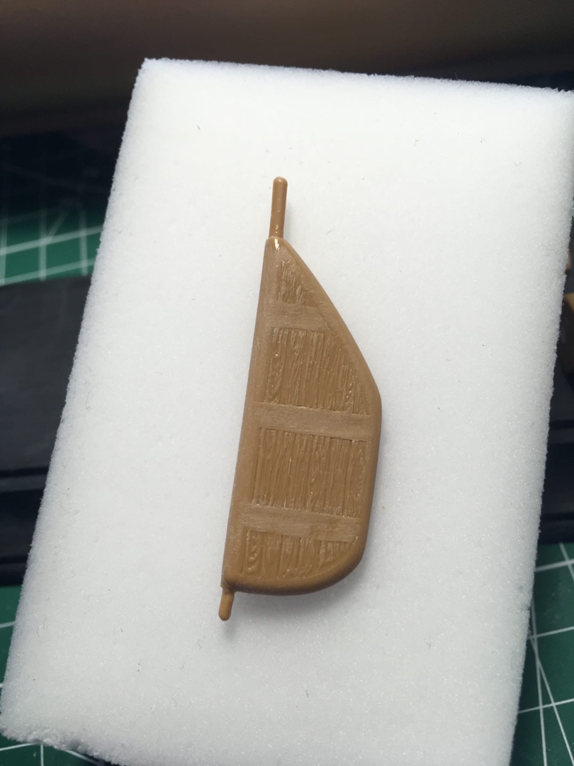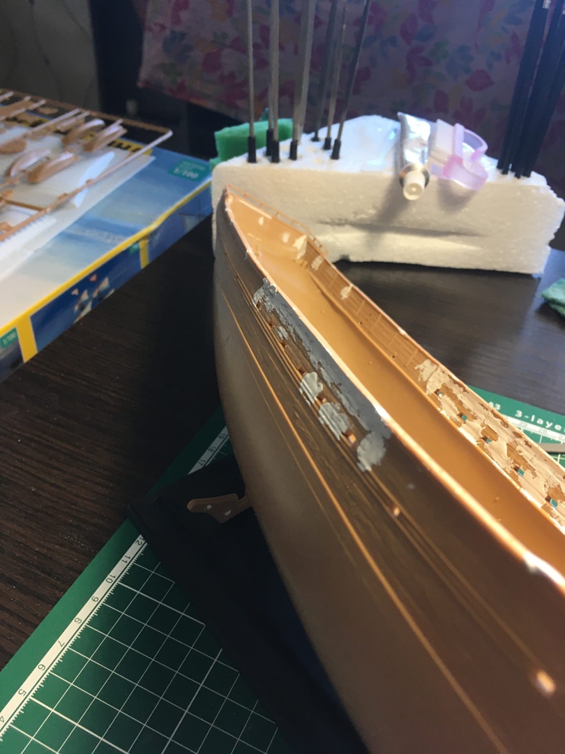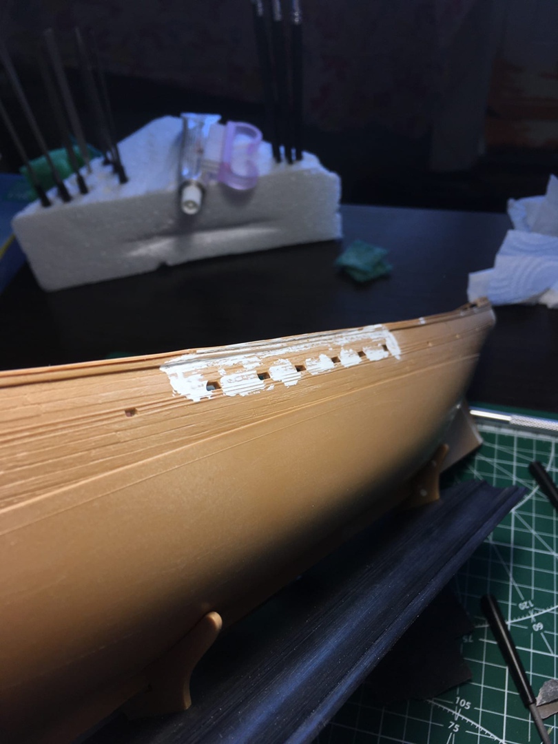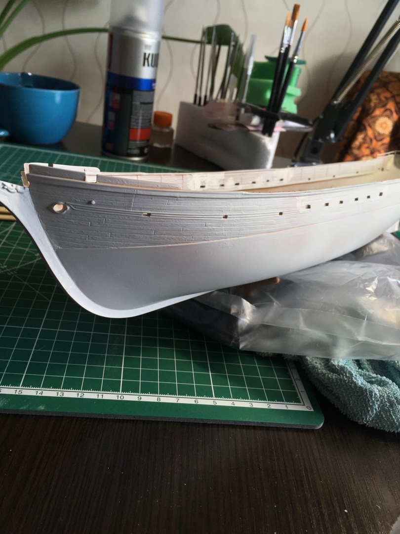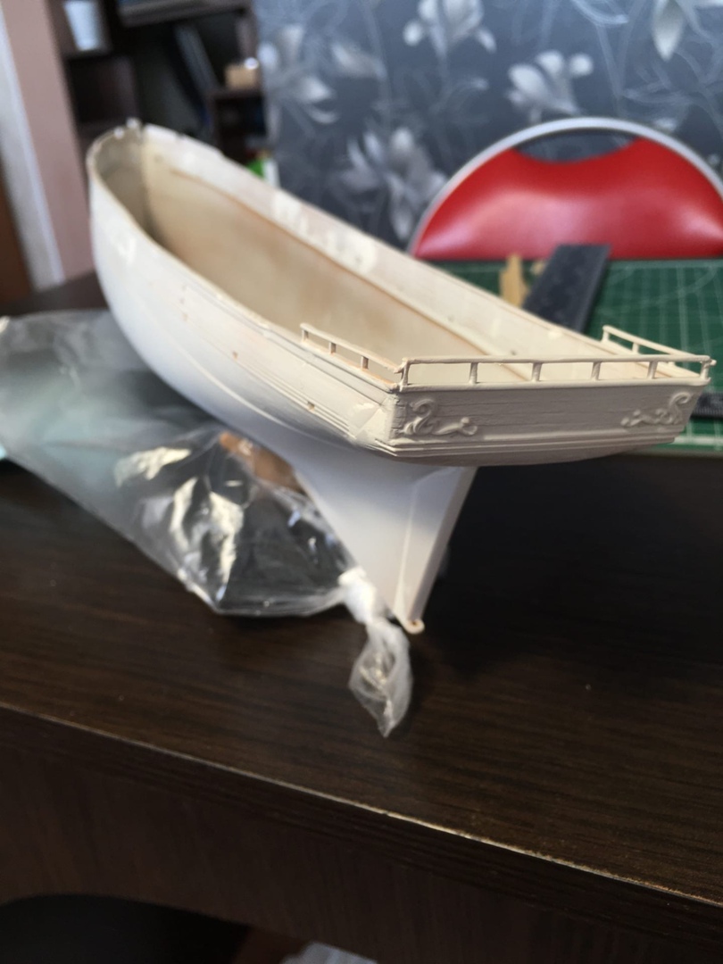 Акрил можно мешать, так что, думаю, проблем с выбором цвета у меня не будет. Хочу сделать борты под темное дерево, белую ватерлинию и красный борт ниже ватерлинии.