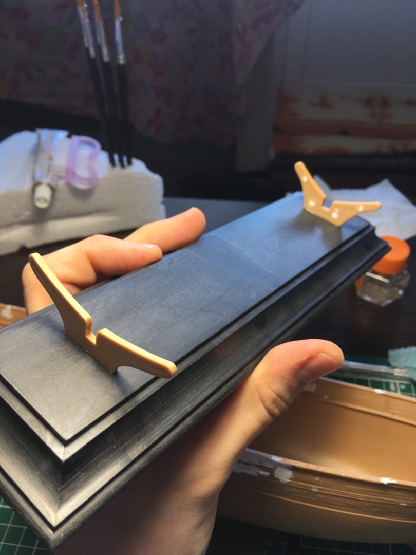 Немного изменил форму руля, поменял местами пластиковые "штыри" руля. Собрал и зачистил подставку мелкой наждачкой. Из-за шпатлевки и нождачки в некоторых местах теряется текстура дерева, поэтому я вручную прорезаю ее скальпелем и немного шлифую.