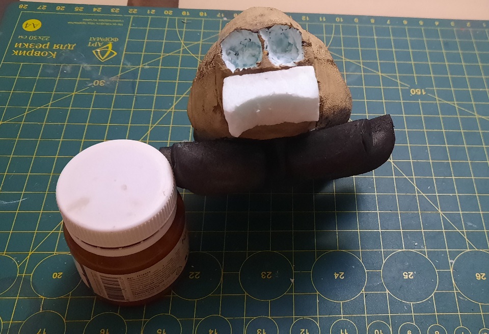 Головогрудь покрыл светлой охрой акрил. Темная полоска под неё не подойдёт, так как покрывать её буду серой пенькой. И глаза чёрного цвета будут смотреться более выразительно на светлом фоне