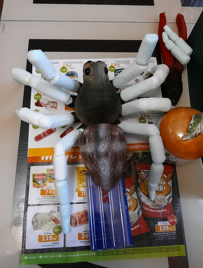 Приступаю к сборке частей паука. Приклеил брюшко . Далее собрал ноги. Столкнулся со сложностью их позиционирования поэтому закрепил чем подруку попалось. Далее стыки ног будут шпаклеваться акриловый шпаклевкой. Клею все на ПВА...Передние ноги до конца собирать не стал, чтобы не мешали приклеить потом халицеры и педипальпы.