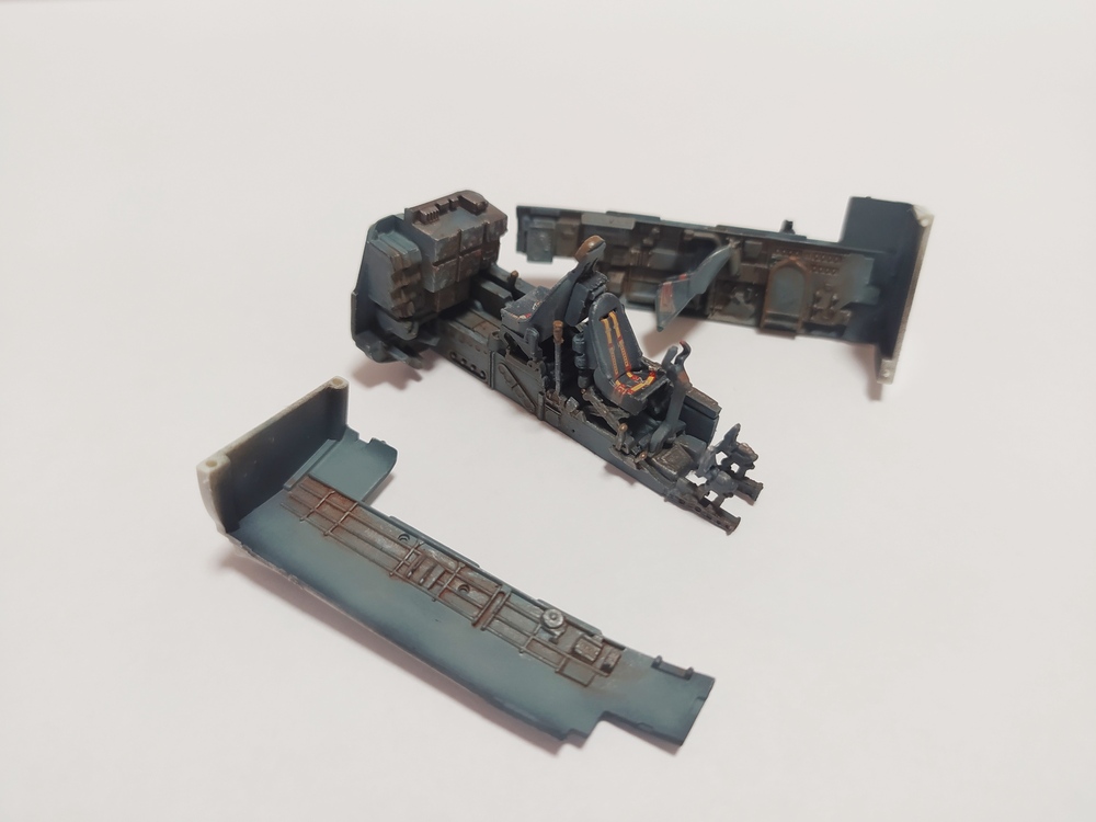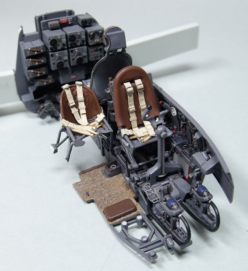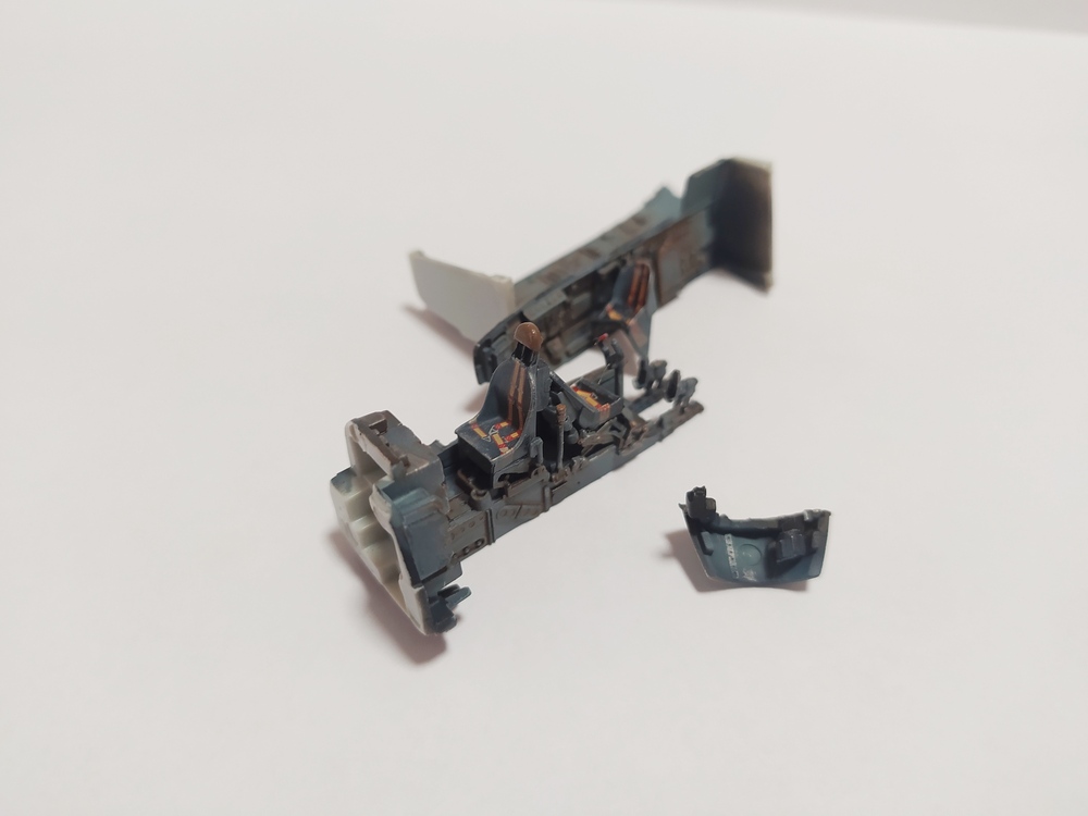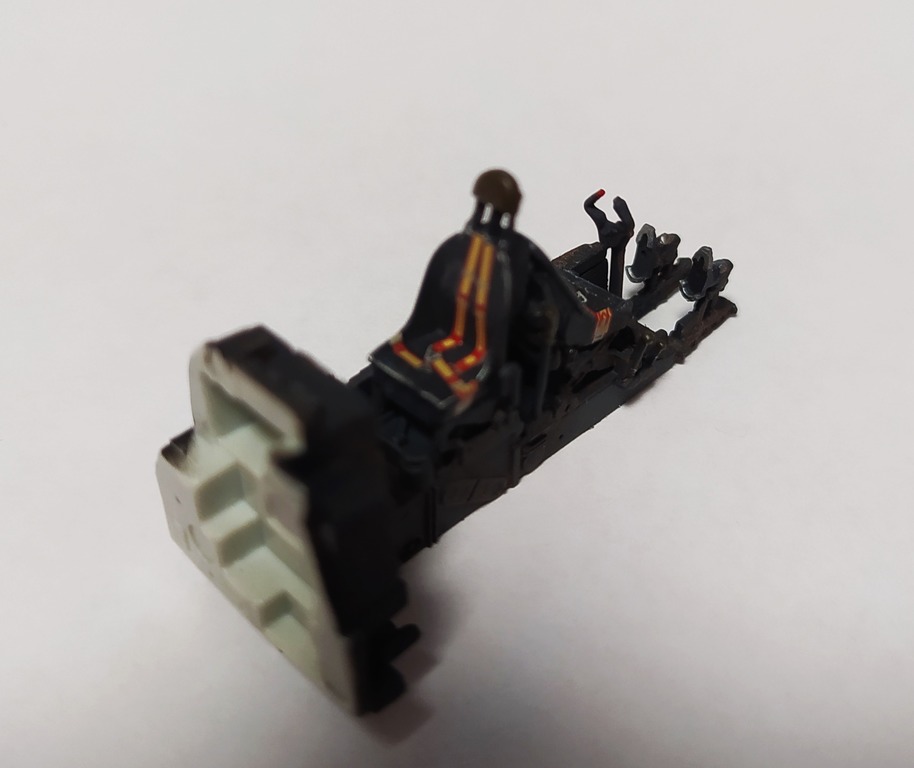 Всем доброго времени суток! Начал работу, как положено, с кокпита. Собирал-окрашивал по инструкции и по фоткам из сети. Надеюсь, в цвет попал. Окрашивал, как обычно АКАНом. Сделал смывку маслом на уайт-спирите. Ремни и приборная панель - декальные, из коробки. Если все нормально, соберу кокпит в единое целое и продолжу стройку.