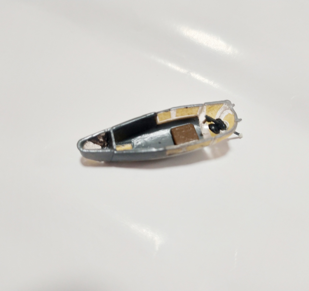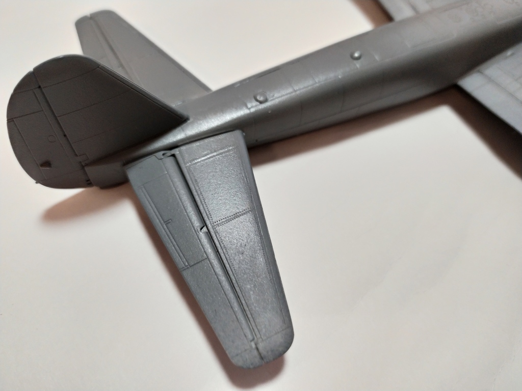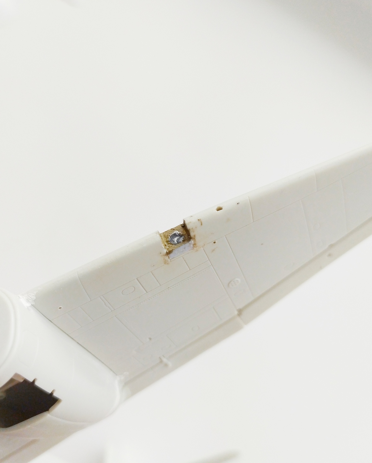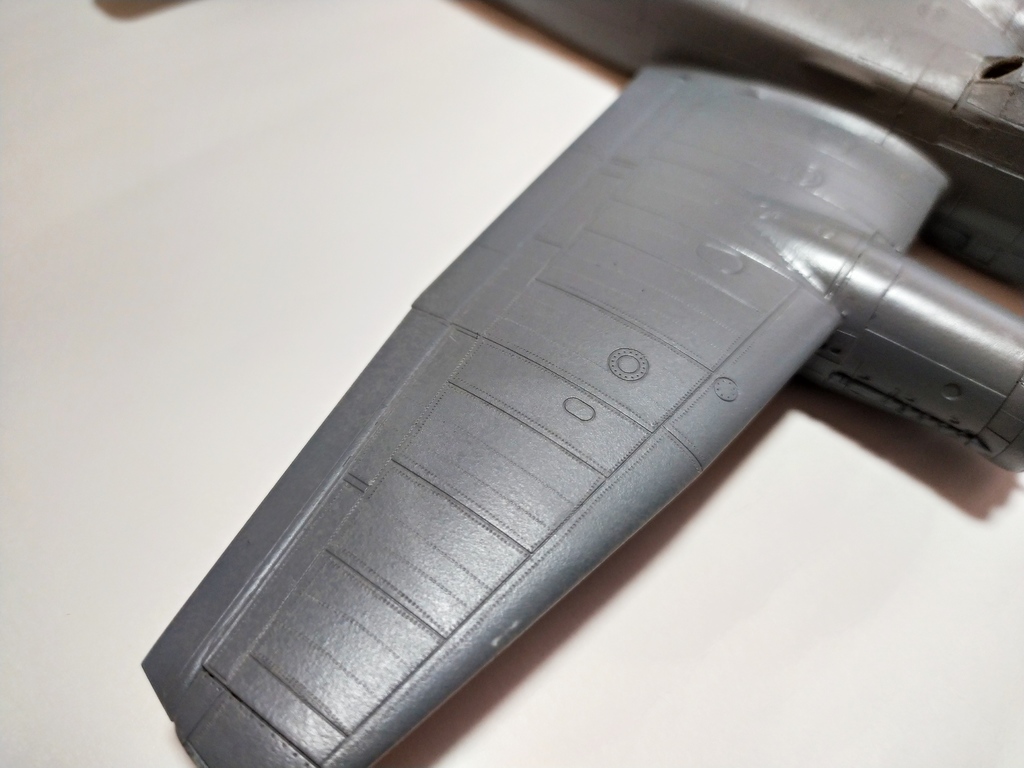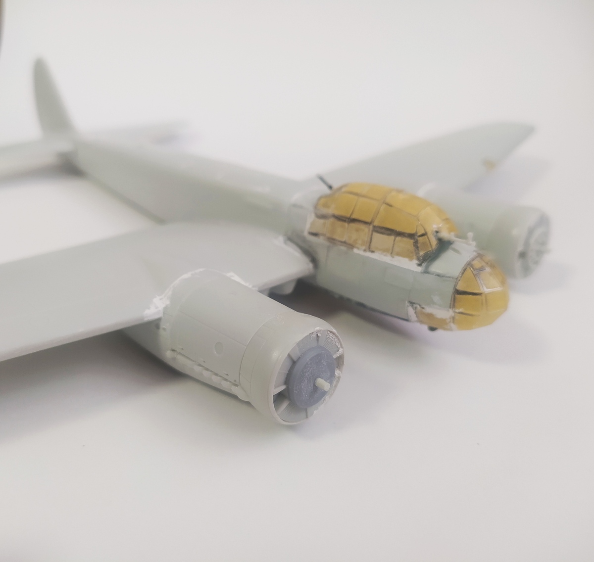 Продолжаю работу. Обнаружил, что фара в крыле просто обозначена зияющим отверстием, закрытым сверху стекляшкой. Облагородил с помощью пластика, маркера Molotow и капли эпоксидки. Далее последовала гондола нижнего стрелка. Установил перегородку и бросил подушку под колени. Собрал полностью тушку самолета, шпакля требовалась практически на всех стыках. Куда-то потерялся диск-основание одного из винтов. Выточил из пластика на дрели новый диск. Осталось приклеить гондолу стрелка и потом на проявочную грунтовку. Клеп нанесу уже по финишной грунтовке.
