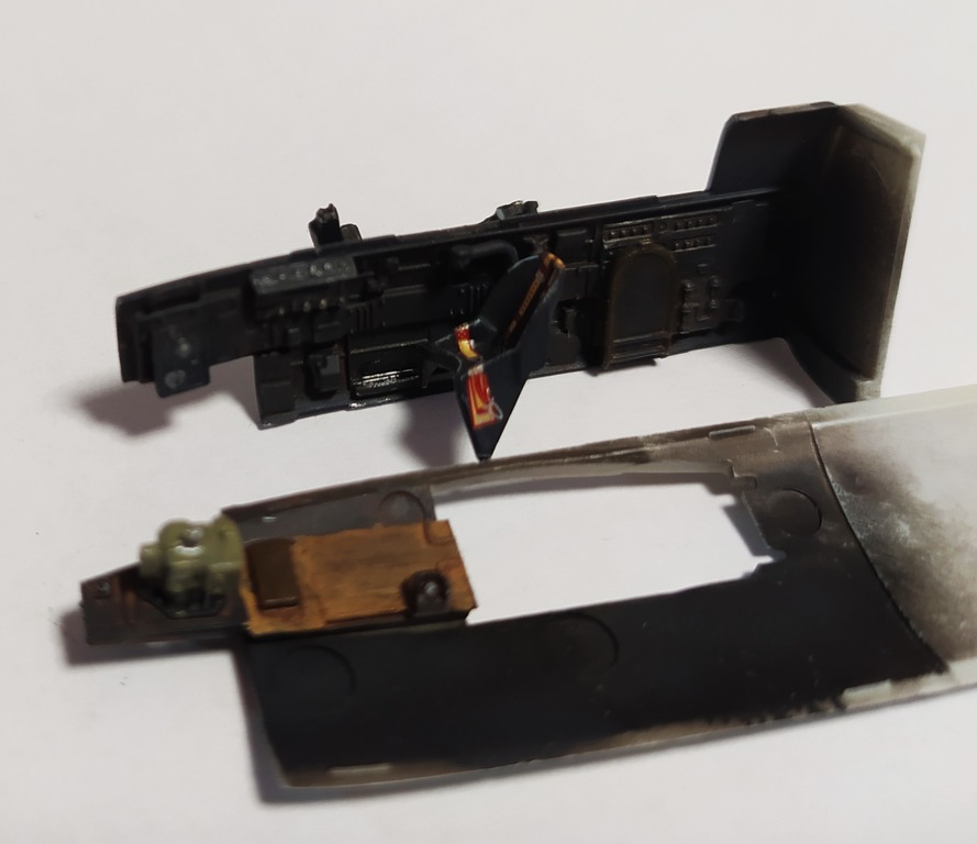 Вообще это была попытка намешать темно-серый цвет. Чисто черная здесь только приборная панель (и та уже под декалью). Попытка не удалась. Попробую уже пройтись нейтральным серым, только жидко разведенным. Кресла трогать внутри не буду - там уже ремни переведены.
