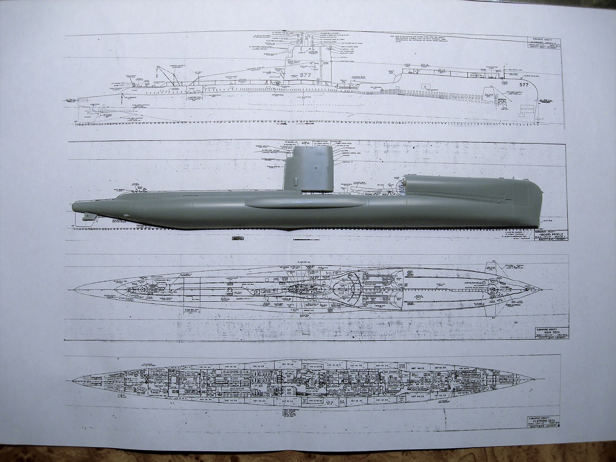 Ну а пока решил проверить геометрию корпуса. Различных схем SSG-577 в сети предостаточно, но вот чертеж тоже нашелся. Судя по всему он проектный из состава эксплуатационной документации. И модель легла в него идеально. Скорее всего она и создавалась на основе данного чертежа.