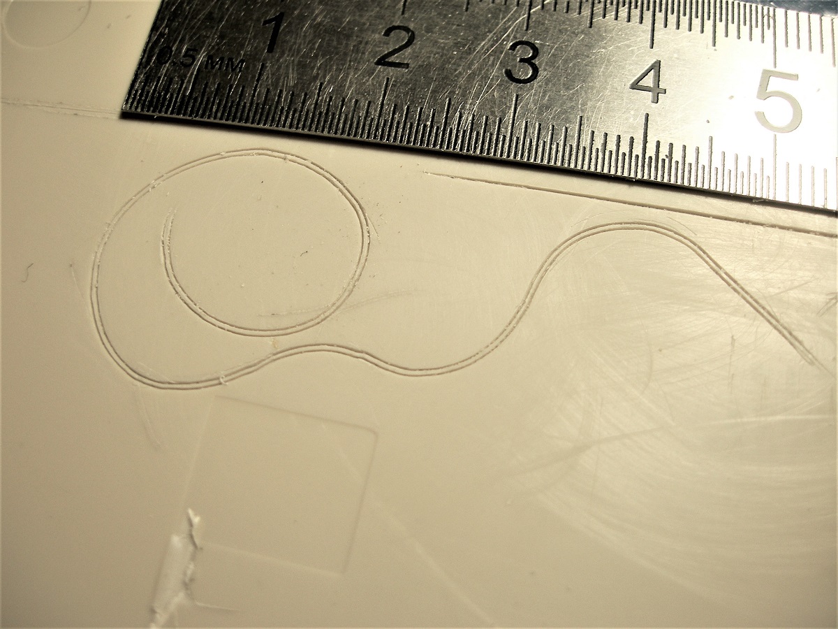 Игорь, Александр Олегович, спасибо за советы. Идея с проволокой мне как-то в голову не пришла. Как вариант, может прорезать канавку обычным скрайбером, а затем внутрь вклеить проволоку? Надо будет попробовать все варианты на кошках. Ну а пока потренировался в работе спаренным резаком. вот такая вот загогулина получилась