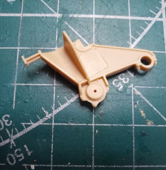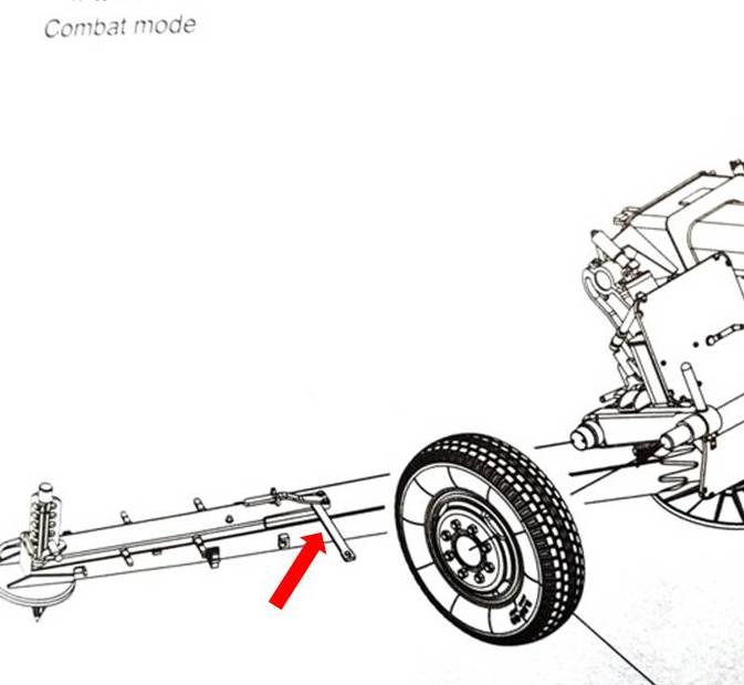 По ходу сборки выплыл ещё косяк производителя. Рычаг механизма подъема-опускания колес в боевом и походном положении в сложенном виде закрепляется по-разному. В походном - в лирке в правом верхнем углу щита. Именно этот вариант и предлагает производитель как для походного, так и для боевого положения. Но в боевом положении сложенный рычаг закрепляется в лирке на кронштейне щита, гораздо ниже. Пришлось колхозить лирку, и хотя строго на место её поставить не удалось, все же существенно ближе к оригиналу чем то, что предлагает Трумпетер.