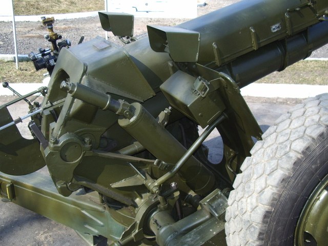 Он не должен касаться земли, чтобы при выстреле на механизм не передавалась нагрузка - иначе поломка домкрата неизбежна, а это означает невозможность перевести орудие в походное положение. Это - плата за возможность кругового обстрела.