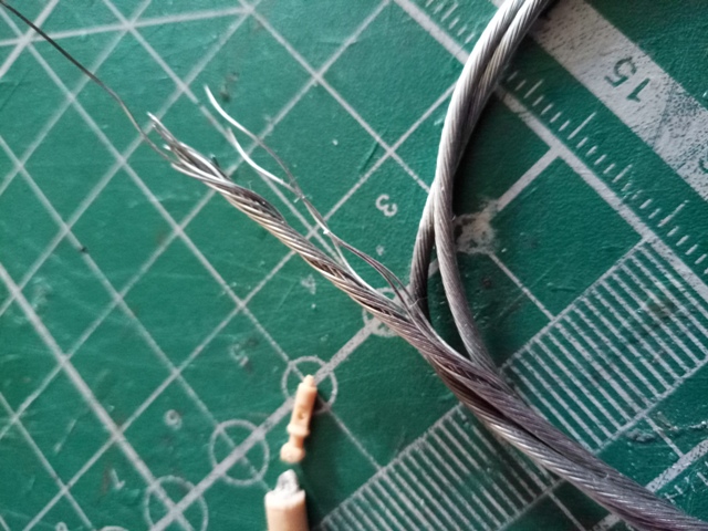 Осталось соединить эти две детали на стальную проволочку - её я взял из расплетенного стального тросика (брал когда-то на буксирный трос, оказался толстоват, в коуши не влезал. Кстати, его же я использую в качестве полупальцев при сборке гусениц, если толщина траков позволяет их сверлить).