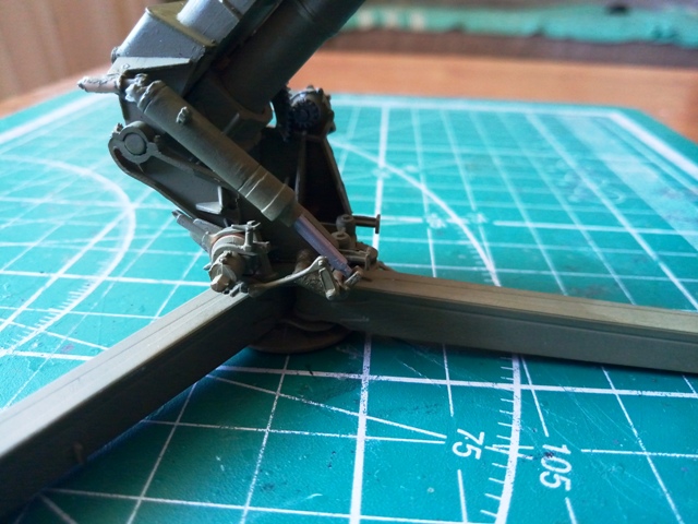 Ещё один косячок от трумпа. Установлены по схеме "кривошипы" колес в верхнем (боевом) положении и щит. В результате колеса при повороте цепляют за станины. Понятное дело, при сборке в неподвижном варианте, как предлагает производитель, это не важно, колеса расположены справа и слева от центральной станины. Но в моем случае это приходится исправлять. Поднять "кривошипы" выше мешает щит. Пришлось все это отдирать, щит крепить максимально высоко, и "кривошипы" крепить с упором в щит. Примерка показала, что теперь колеса за станины не цепляются.Высохнет клей - сфотографирую. Или позже.