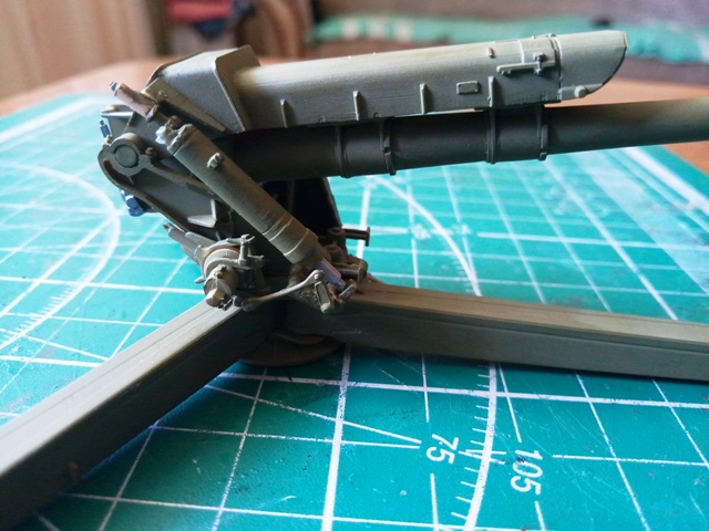 Сделать подвижной поворотную часть оказалось несложно. С подъемной частью посложнее. Свободно вращающаяся шестерня подъемного механизма и свобода движения люльки в цапфах - это ещё не все. Есть ещё один механизм, обеспечивающий подъем и опускание ствола - уравновешивающий. И вот тут оказалось посложнее. На настоящем орудии он представляет собой пневмоцилиндр под давлением.