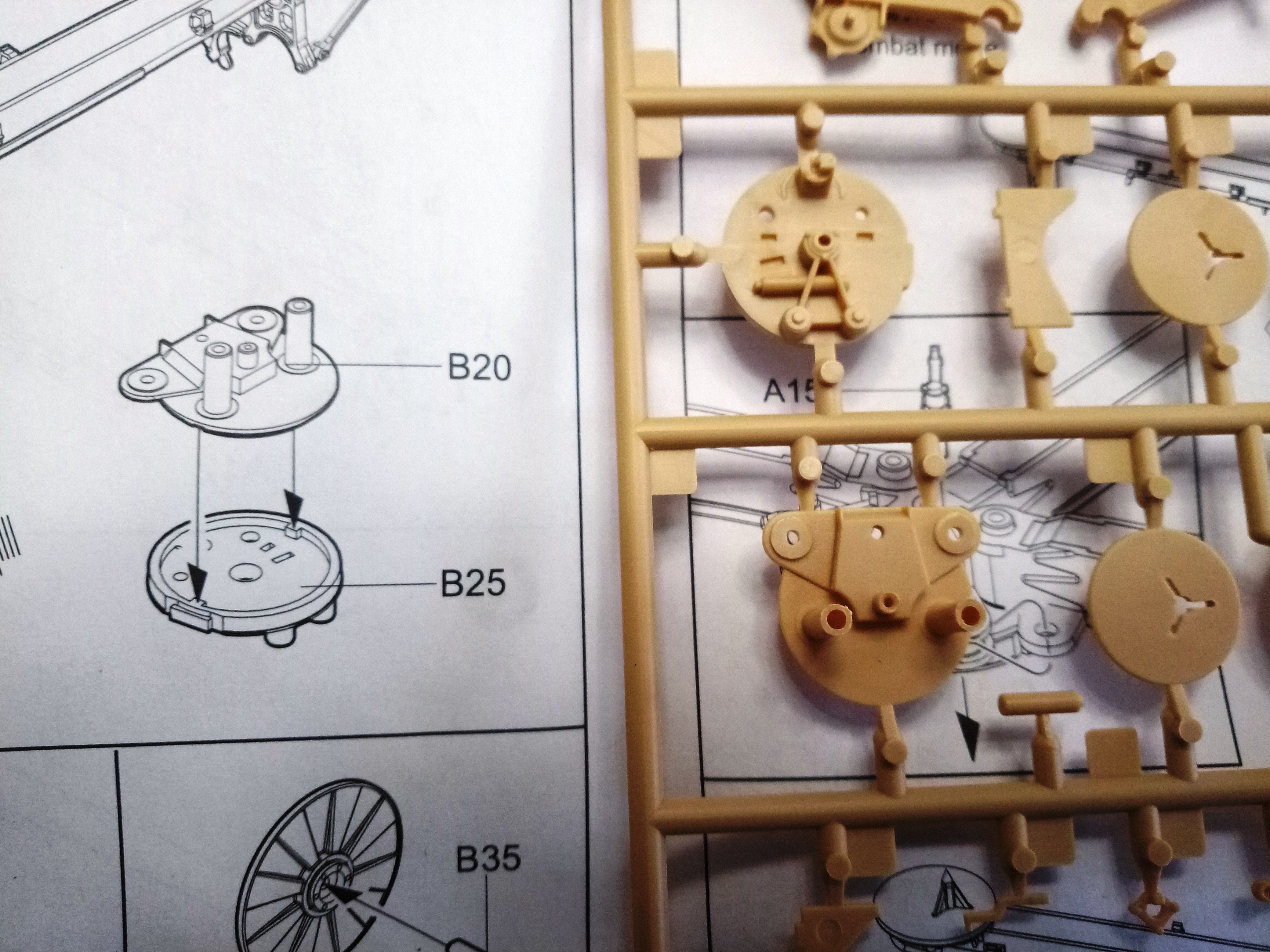 Склеил намертво крышки цапфы А13 с боковыми деталми верхнего станка В31 и В32. Инструкция предлагает склеивать их после соединения боковин с основанием верхнего станка, с вложенной люлькой со стволом, но в этом случае высока вероятность попадания в соединение клея, что приведет… Ну, вы поняли.