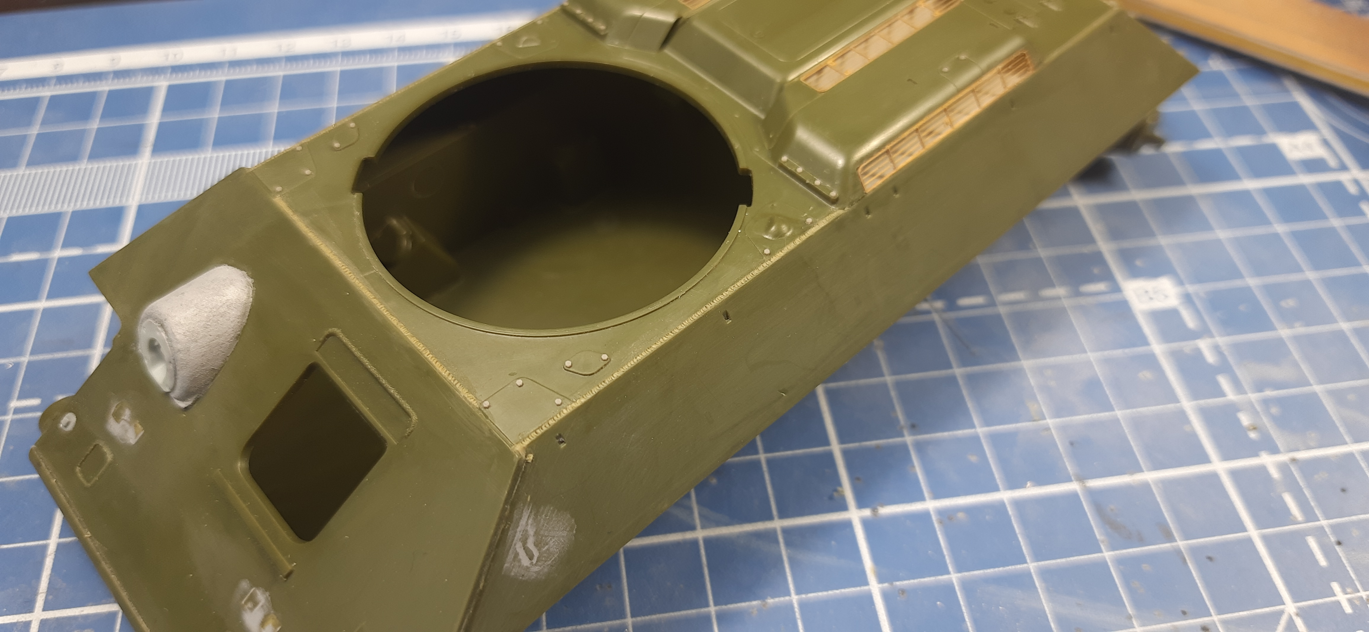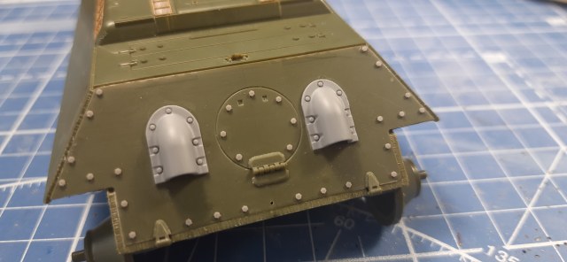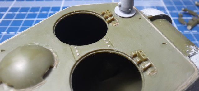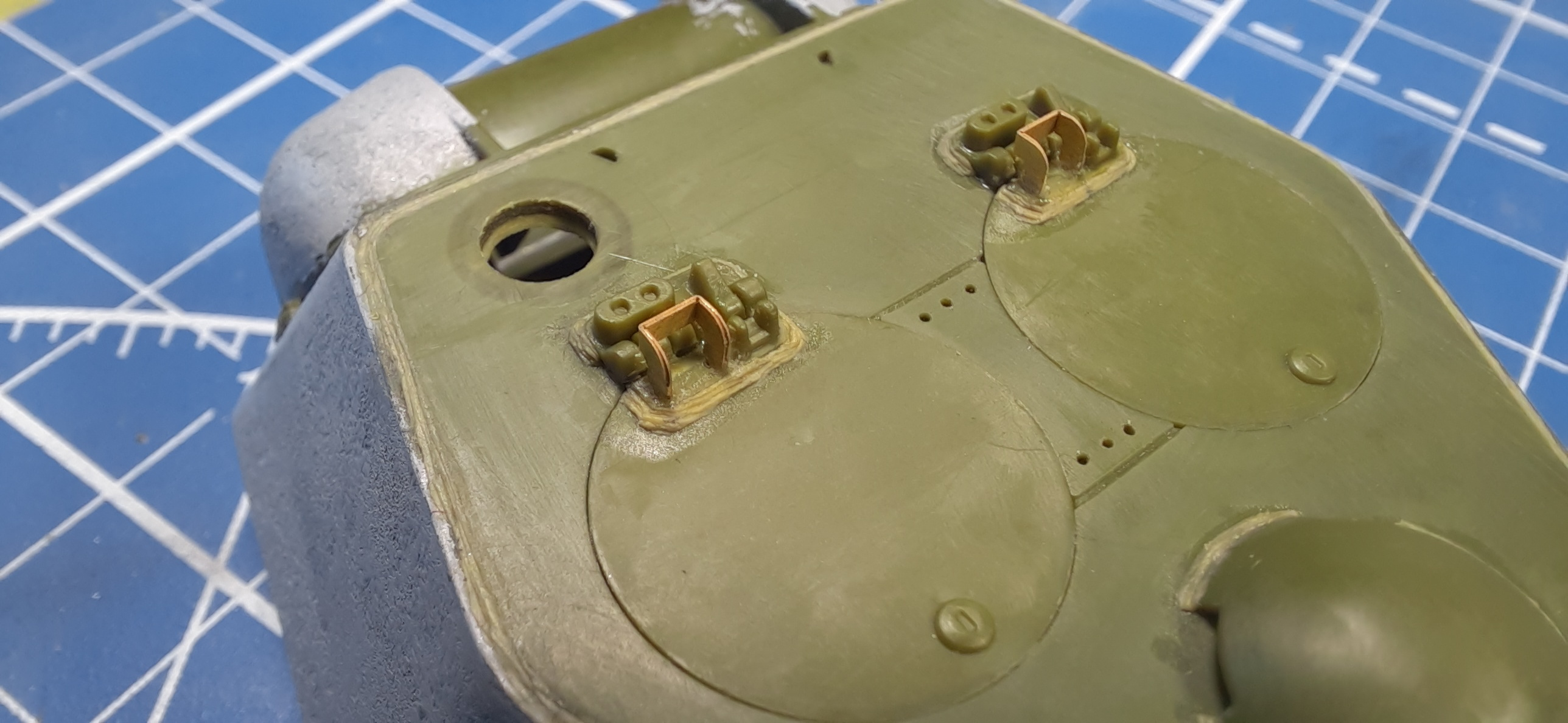 В качестве замечания могу добавить следующее - на машинах Кировского завода петли колпака с сеткой (который над крышей трансмиссионного отделения) сдвинуты ближе к продольной оси корпуса. Это хорошо видно на фото из сообщения #17.