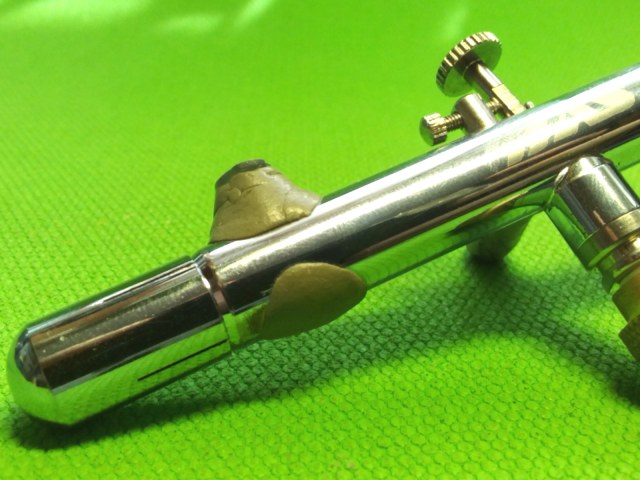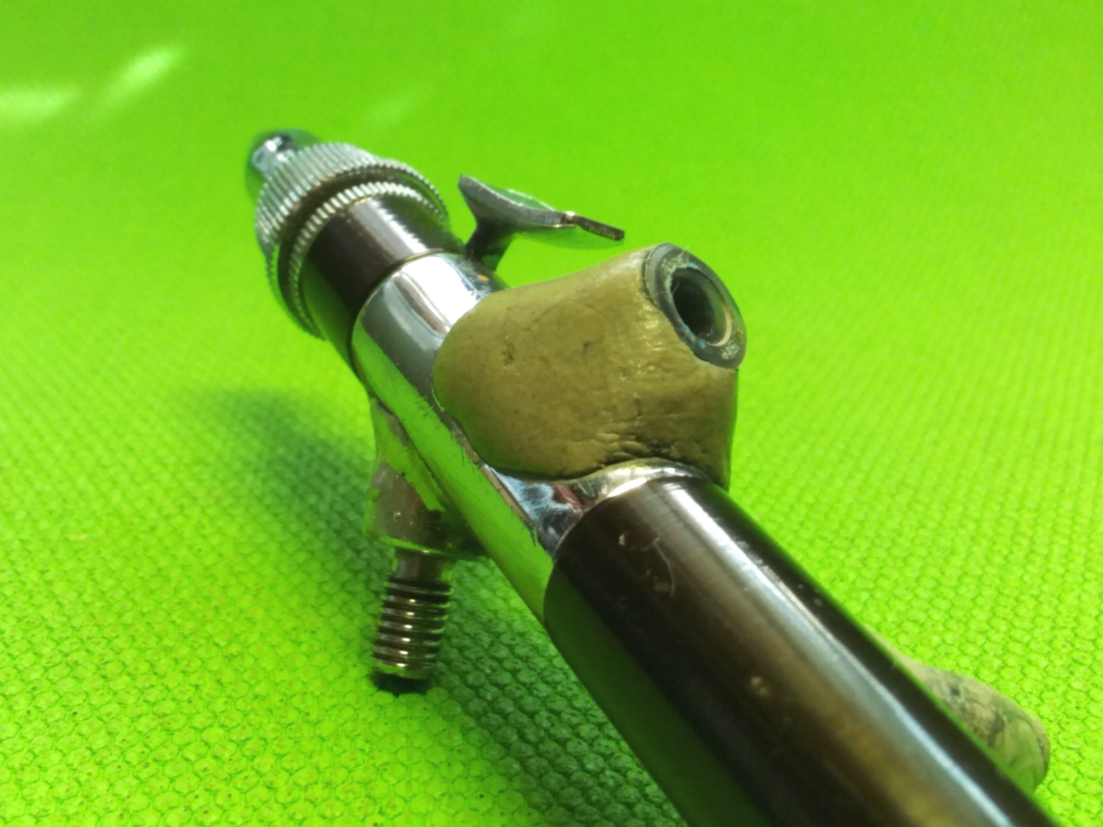 Аэрограф был разобран. Подобраны 3-и трубочки по диаметрам: 1. отверстия под сопло краски; 2. отверстие под уплотнение иглы аэрографа; 3. отверстие в корпусе иглы шприца. Трубочки 1 и 2 были одеты одна в другую и помещены в корпус аэра – имитация канала подачи краски. Оставшееся свободное пространство заполнялось эпоксилином. Торец трубочки 3 проточен надфилем так, чтобы плотно охватить диаметр трубки 1, после чего вдавливался в эпоксилин, а по ней уже вдавливался корпус иглы. Для усиления, вокруг корпуса иглы формировался валик. После частичного схватывания состава все трубочки удалялись. После полного схватывания, удалены остатки эпоксилина из корпуса иглы. Аэр получил право на дальнейшую жизнь.