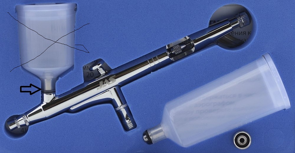 При этом получил ряд преимуществ от оригинала: - герметичность соединения емкостей для краски; - широкий спектр используемых емкостей. Хоть шприц 1 куб, хоть 20 кубов; - простота промывки, как аэра и емкости для краски. Достаточно, не снимая использованного шприца, обдать его растворителем и краска стекает вниз, после чего выдувается в штатном режиме. Последующее заполнение чистым растворителем и промываем все начисто. Осталось только ватной палочкой промокнуть внутренние стенки корпуса иглы… Со временем меня уже не удовлетворяло качество, и ширина факела краски аэра… выбор пал на дешёвый JAS 1123.