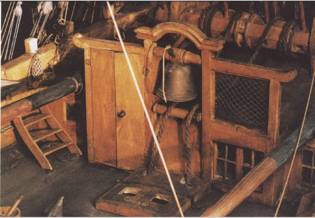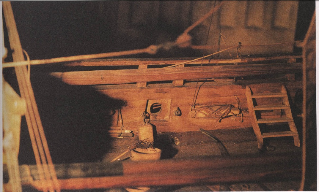 Трап на форкастль. На данной модели, очевидно, из-за показанного запасного рангоута, трап переставлен на девяносто градусов. Для нас останется загадкой, что случилось с моделью (а она частично разграблена), и почему запасный рангоут установлен не на рострах (на фото ростры хорошо видны), а "брошен" на палубу форкастля - что в реальности сильно мешало бы работе команды. Так что трап развёрнут "вынужденно":