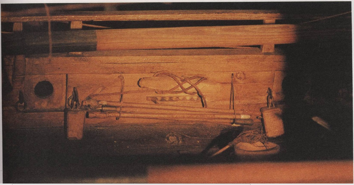 Так же был вопрос коллеги про хранение принадлежностей к орудиям. Обратите внимание, на фото видны - галс-утка, под ней - прибитый к фальшборту кранец для так называемых "ядер первых выстрелов" на два орудия, собственно, сами принадлежности к орудиям, заметны банник и клоц в чехольчиках, витиеватый пыжовник/шуфло, прибойник. Так же можно заметить клинья для вертикальной наводки пушек, подвешенные к гакам для быстросъёмного брюка. Ватервейс показан сильно просмоленным, в ватервейсе зияет отверстие шпигата - свинцовая труба, развальцованная по канту: