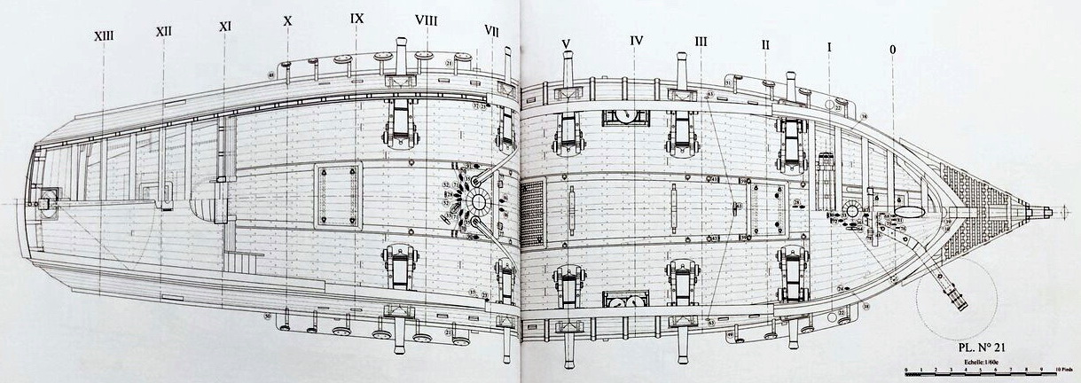 Вячеслав, данное обстоятельство напомнило мне, что в работе этого автора, "фрегат Аврора", мест для хранения весел тоже не было предусмотрено. Видимо, не жалует Леминье ростры. А весла, они именно те, из которых одно нарисовано над квартердеком? Или это весло для шлюпки?