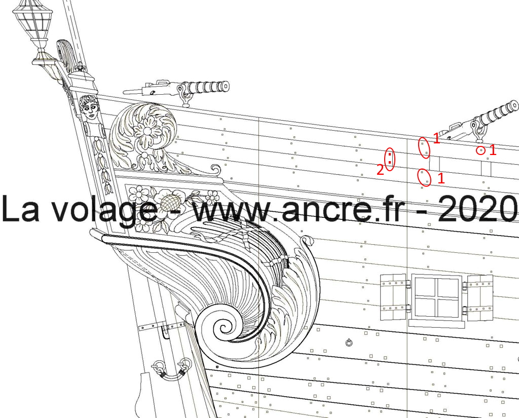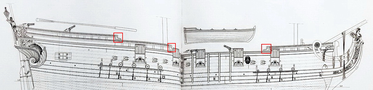 Теперь даже не вопрос а небольшой комментарий: эти декоративные элементы одинаковы с аналогичными у корабля FREGATE LEGERE L'AURORE 1697. То есть, либо эти декоративные элементы были некими универсальными и изотавлялись в одной и той же мастерской, либо создатели монорафии таки немножечко облегчили себе работу.