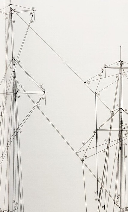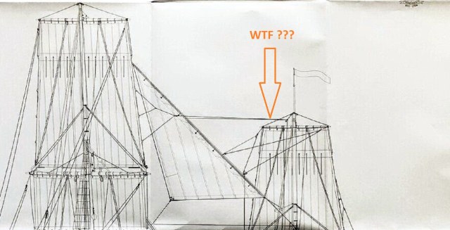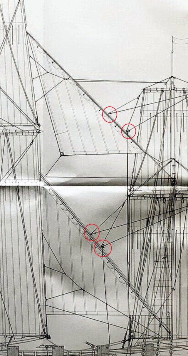 Здесь точно такая же проблема с восприятием - юферсы штага и штаг-крага находятся очень далеко от княвдигеда. Но на поверку оказалось (этот же корабль в виде модели, созданной в период жизни корабля), что здесь грота-штаг-краг идёт всё-таки к форштевню, хотя обтяжка штага осуществляется позади фок-мачты.