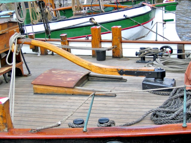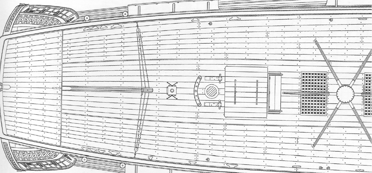 А на этом чертеже сразу увидел, что румпель не имеет румпель-талей, идущих к ватервейсам - ими и румпелем управляли, и фиксировали румпель в определённом положении. Эти тали применяются со времён аргонавтов, используются они и поныне, так что...
