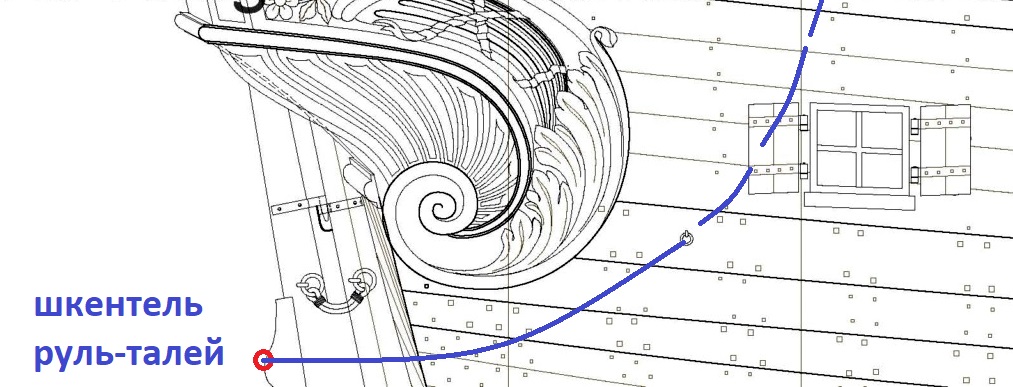 Ещё на чертеже видны сорлини - маленькие снасти, заведённые на рымы на теле руля и ахтерштевня, с каждого борта. У французов ещё использовался вариант, когда был один сорлинь, он начинался на рыме ахтерштевня одного борта, проходил свободно сквозь отверстие (гат) в руле и крепился на рыме ахтерштевня с другого борта. Сорлини не давали перу руля уплыть от штевня при соскоке руля с петель. Но это не вся оснастка руля. Были ещё шкентели руль-талей. На топе пера были обухи, куда заводились два шкентеля - тросовых или цепных, идущих к транцевому реельсу и далее на борта. На бортах были вбиты рымы, через которые шкентели шли дальше, на палубу (в нашем случае) квартердека. При поломке румпеля в огоны шкентелей заводили аварийные руль-тали, эти тали крепились на опять-таки аварийно уложенном поперек ДП рее, талрепы сводились на палубу квартердека, и рулём управляли через шкентели снаружи", так сказать, пока чинится румпель. Шкентелей руль-талей на чертеже почему-то нет. Это плохо.