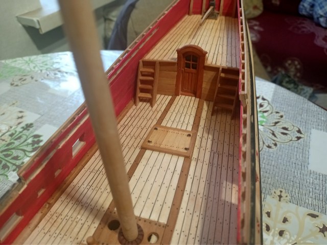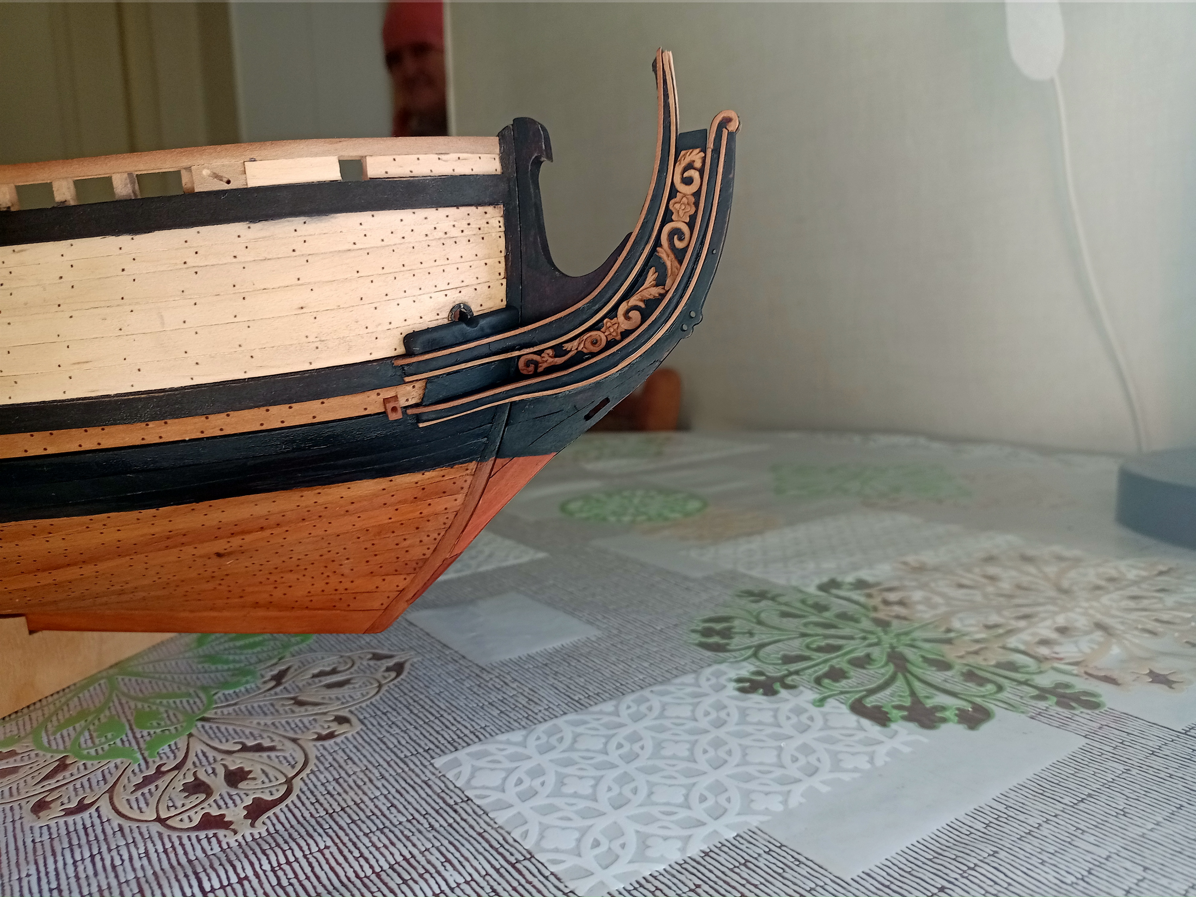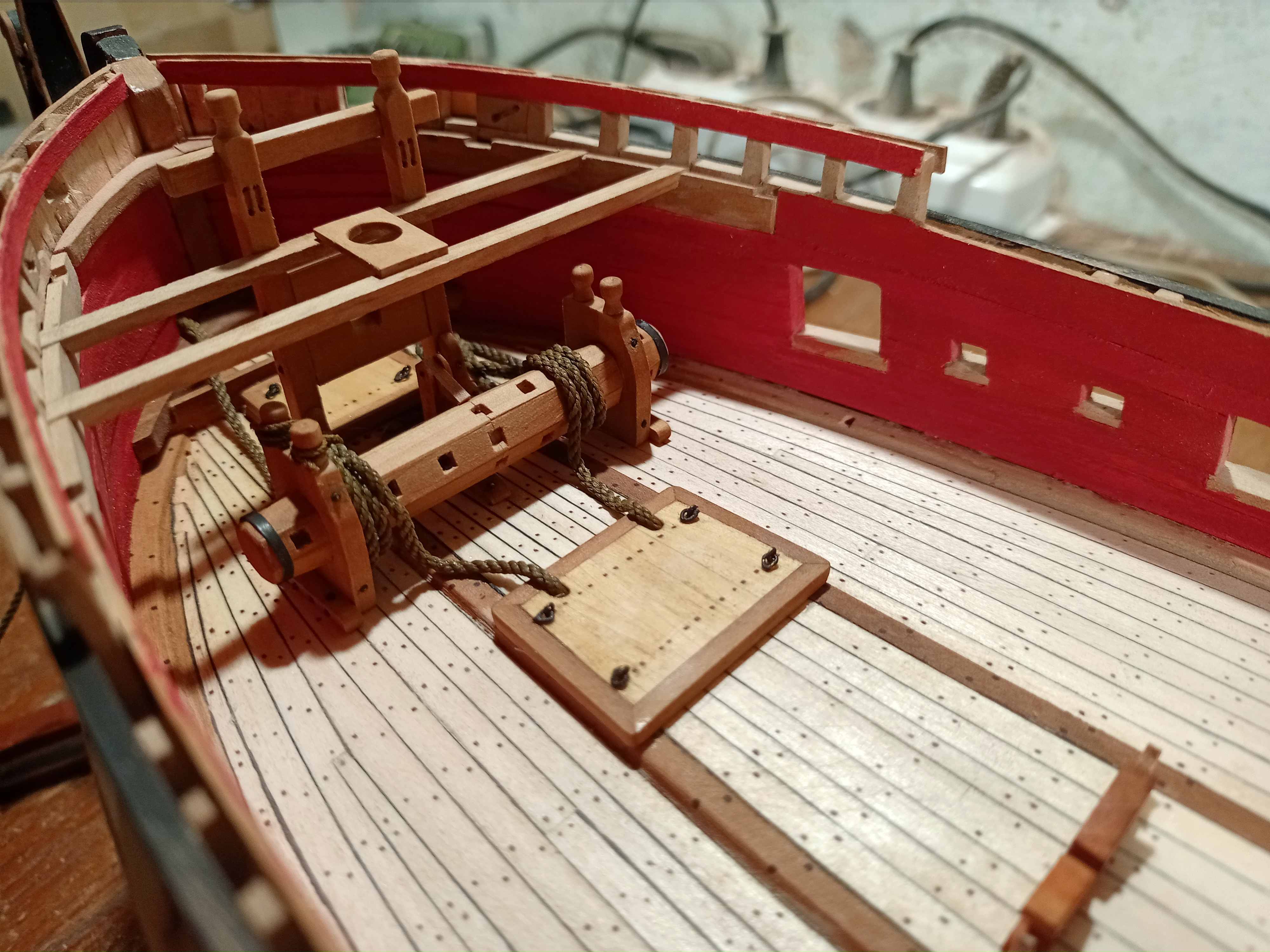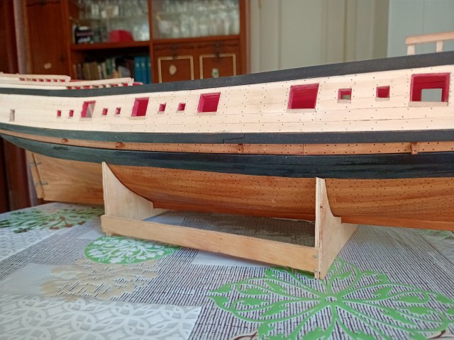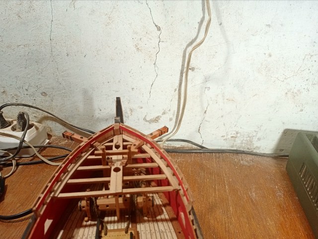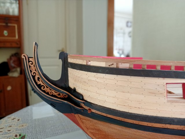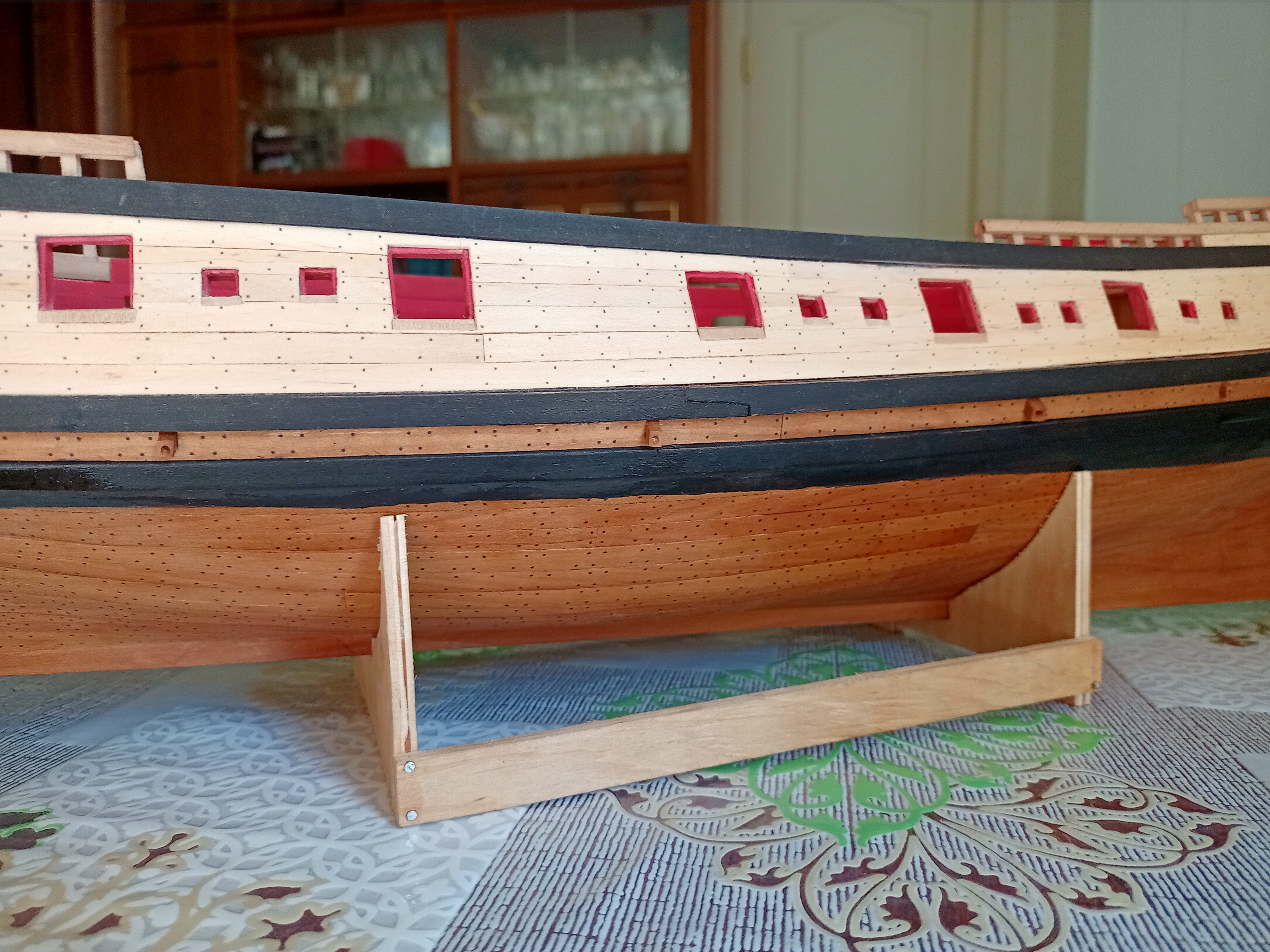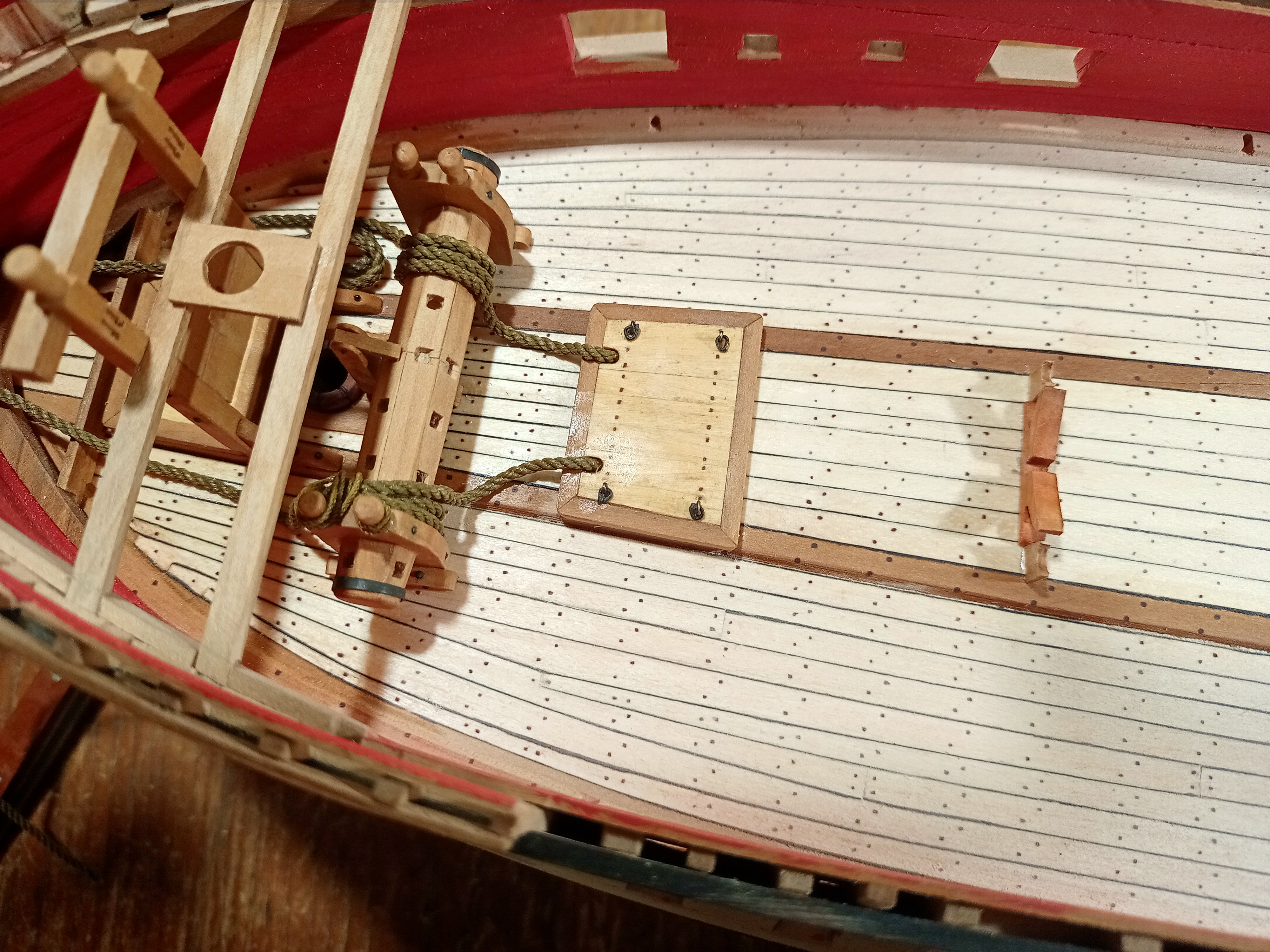 Вячеслав, всё хорошо, но есть совсем маленькая недоработочка. На левом борту сделали, на правом забыли: под вторым пушечным портом правого борта есть поперечный стык досок обшивки, доски в этом месте должны быть прибиты нагелями.