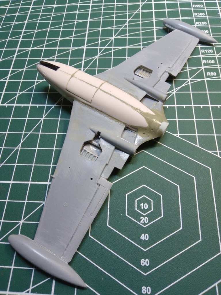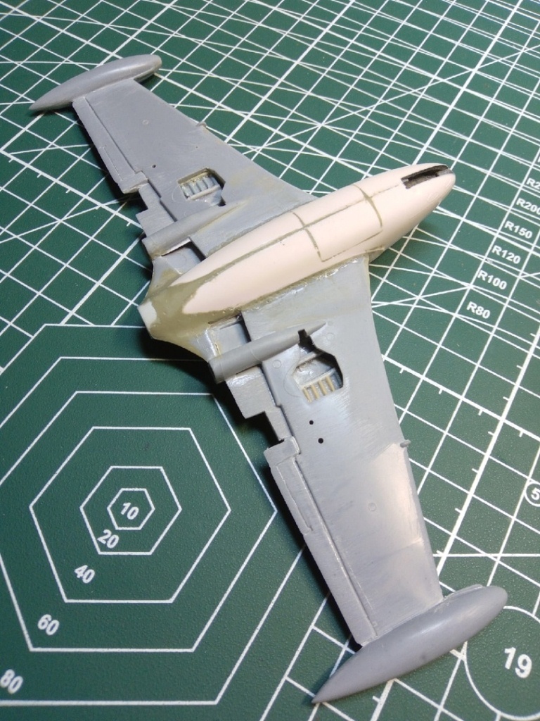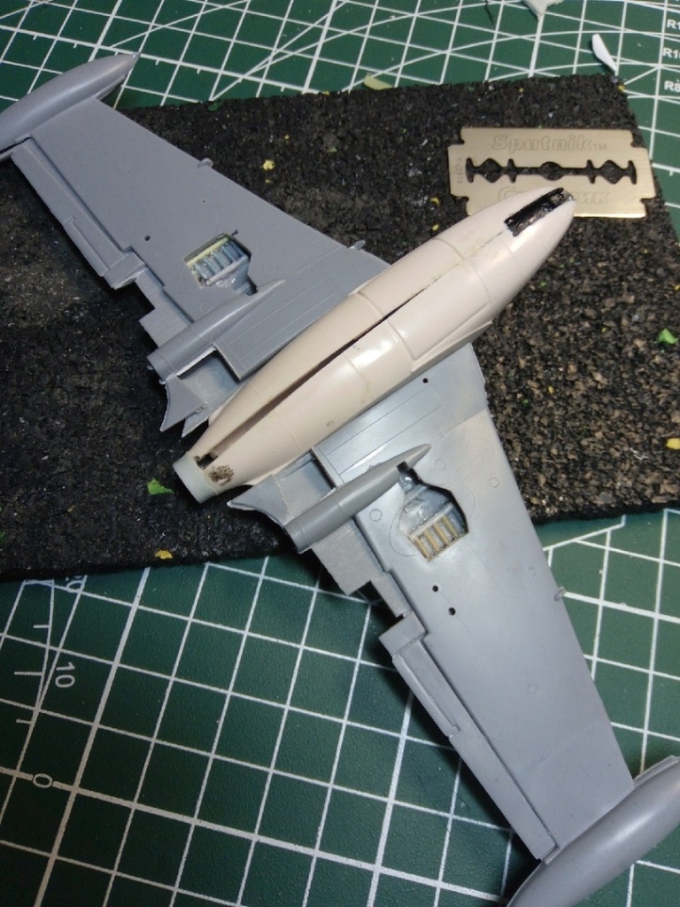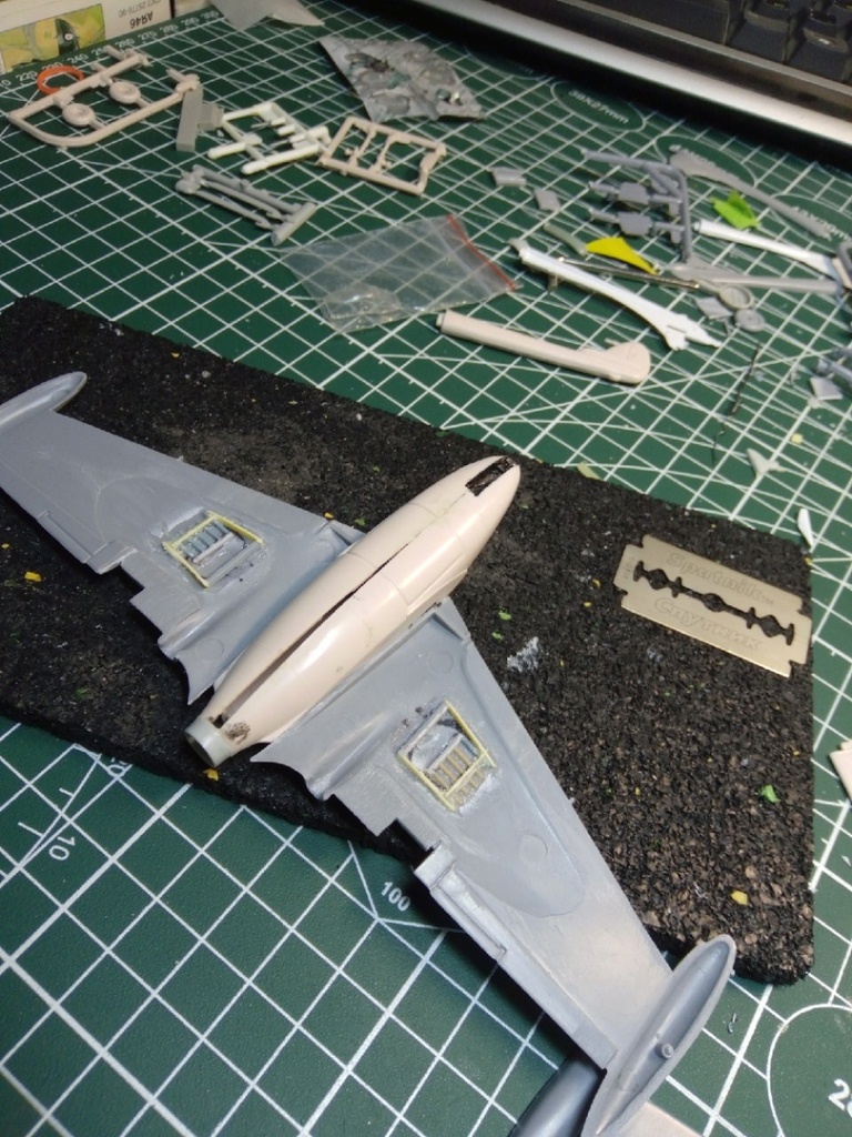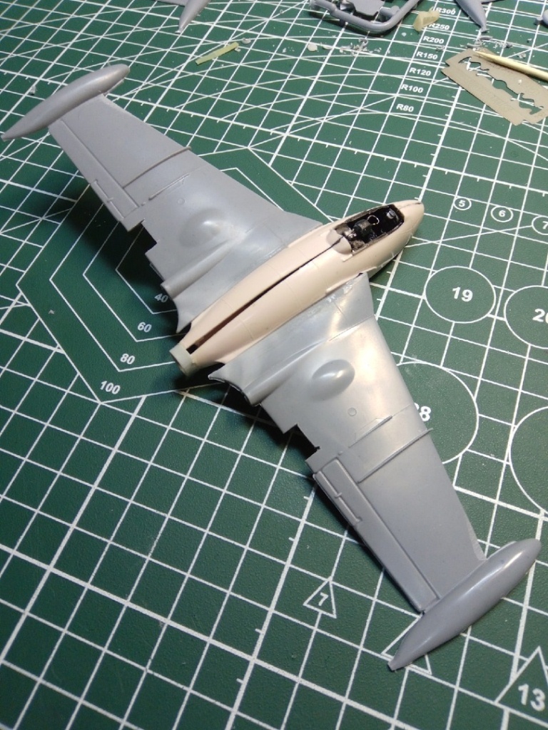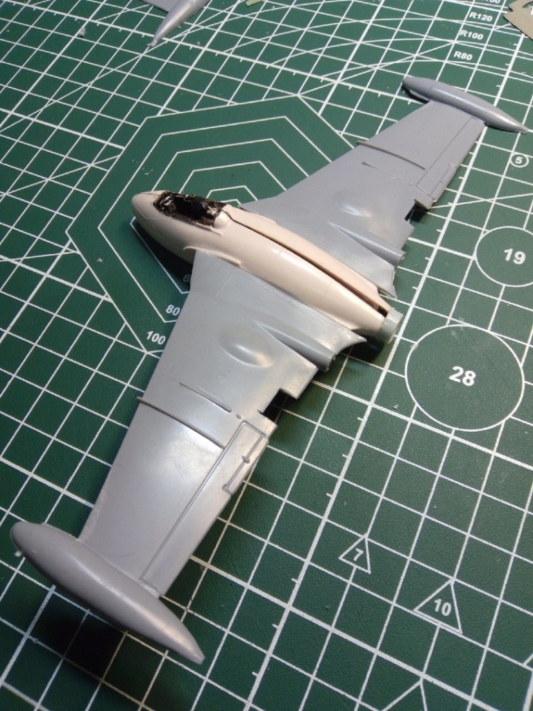 Набор с вампиром мне достался с собранным фюзеляжем и возможно так и оставлю кокпит,учитывая что фонарь будет закрыт. А вот одну сторону в месте стыка крыла я уже сегодня сточил.