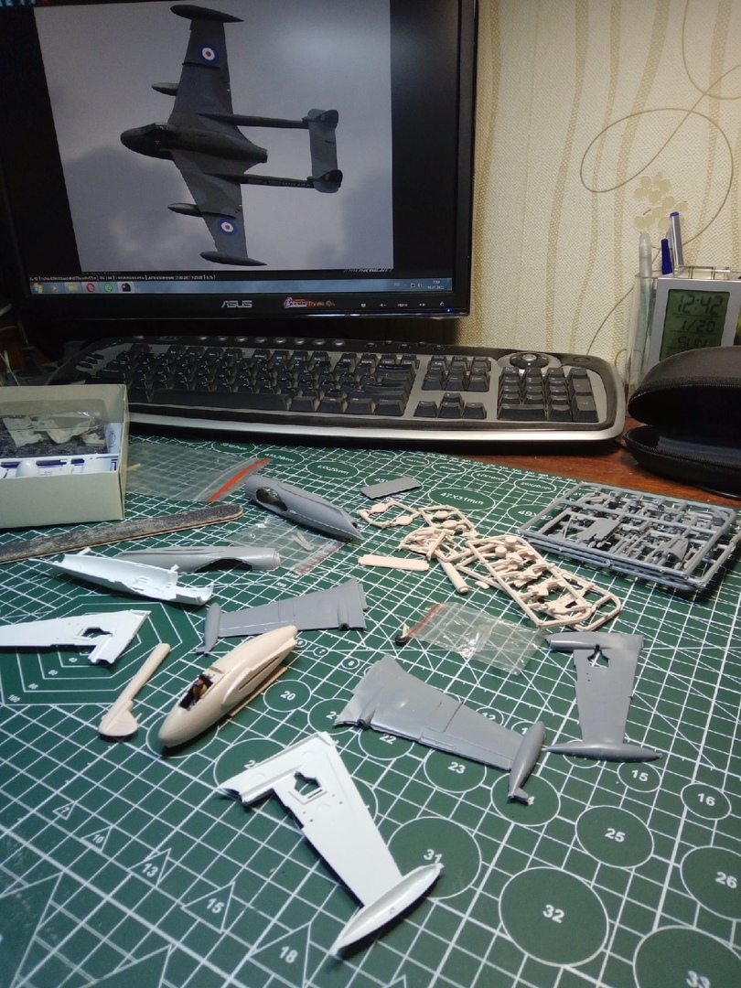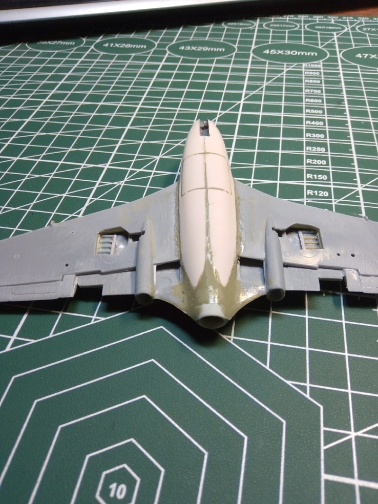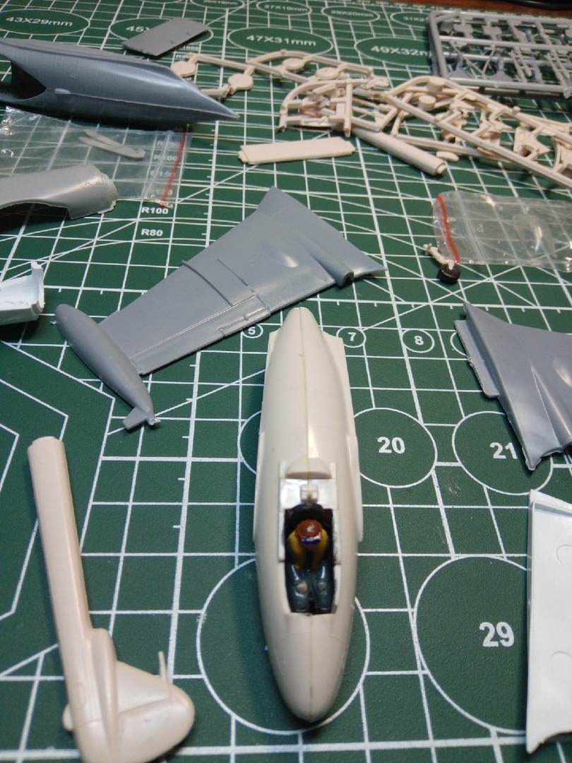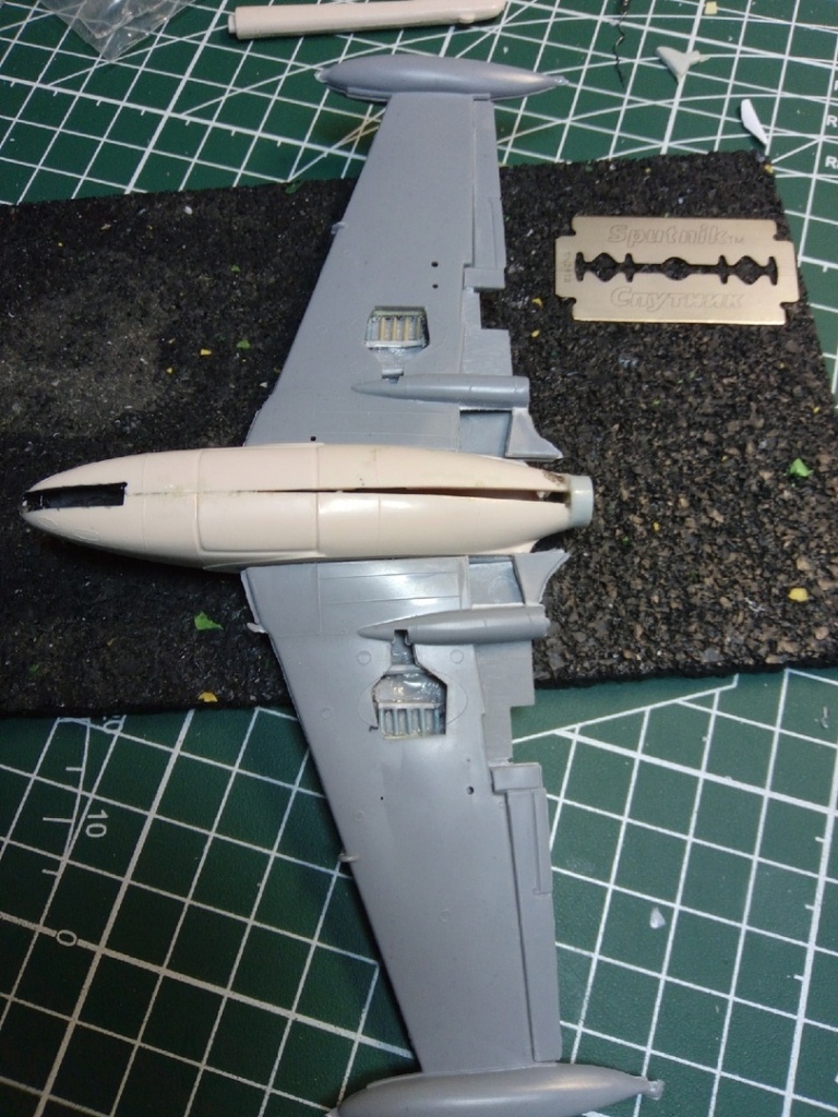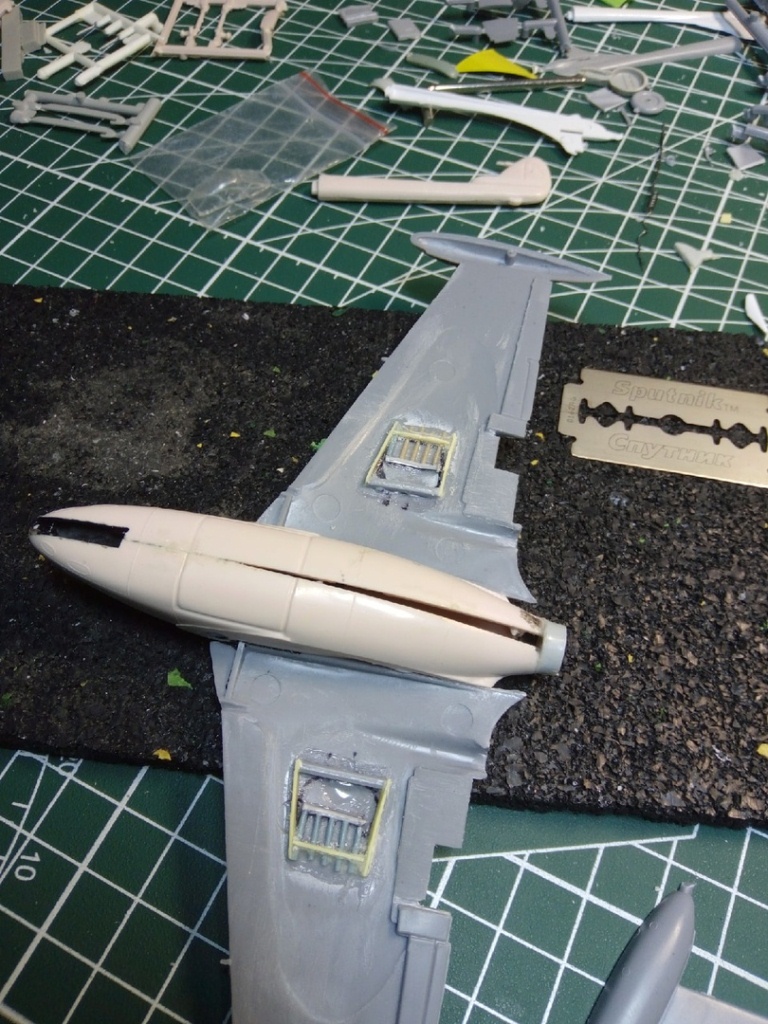 Набор с вампиром мне достался с собранным фюзеляжем и возможно так и оставлю кокпит,учитывая что фонарь будет закрыт. А вот одну сторону в месте стыка крыла я уже сегодня сточил.